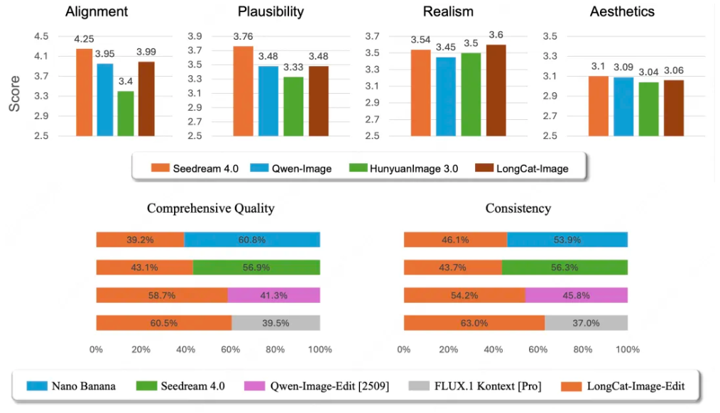 在图像编辑方面采用严格的并列对比评估(Side-by-Side, SBS)方法,聚焦于综合编辑质量、视觉一致性这两个用户体验的维度,评测结果表明,LongCat-Image 虽然与 Nano Banana、Seedream 4.0 等商业模型存在一定差距,但显著超越了其他开源方案。
