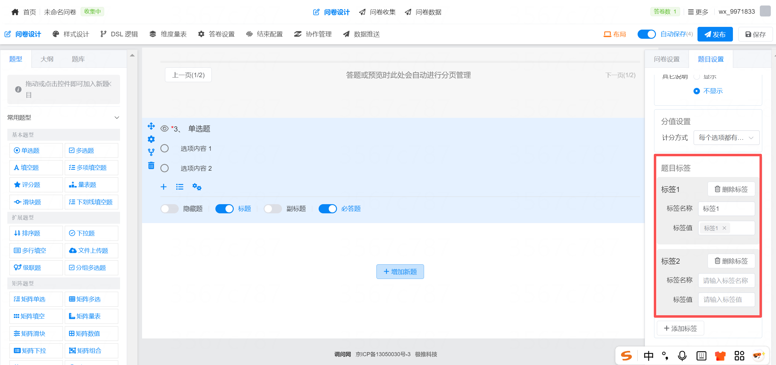 调问团队上周增加题目标签配置能力,主要应用在对题目进行标签分组的场景,通过对问卷题目的标签编辑,更加方便了问卷数据统计分析。