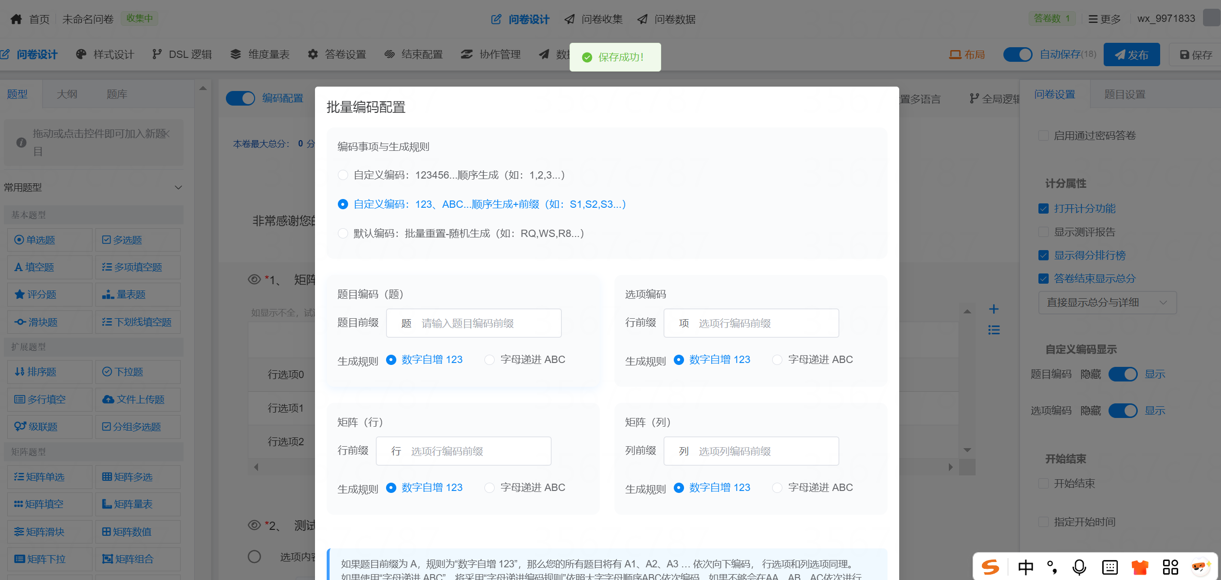 - 答卷页面显示编码,解决隐藏题号后必答标识丢失问题,实现题目标签自定义功能;