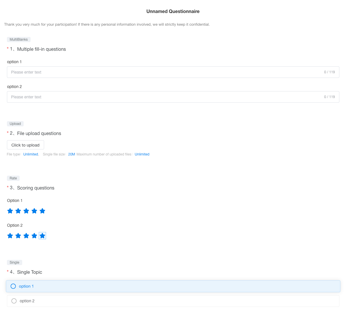 同时还实现了题目、选项可自定义编码,在许多实用场景中,特别是考试场景中,选项习惯显示为A\B\C样式,针对这种场景,调问增加了自定义编码能力,体验更加契合实际应用场景。
