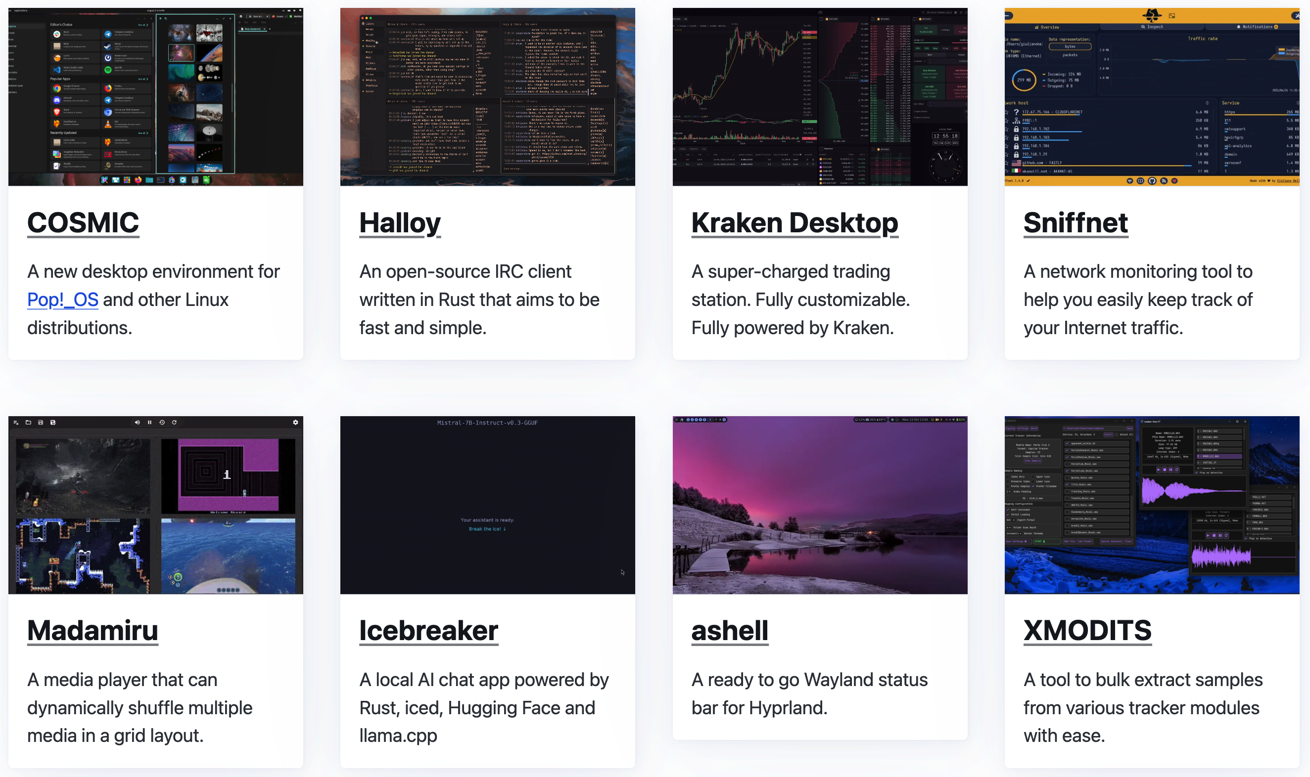 Iced 因为其跨平台、响应式、类型安全、模块化等特点,在 Rust 社区里是较为受欢迎的 GUI 解决方案。许多 Rust 应用已经开始使用它。知名 Linux 桌面环境 COSMIC 就是 Iced 的重要用户。
