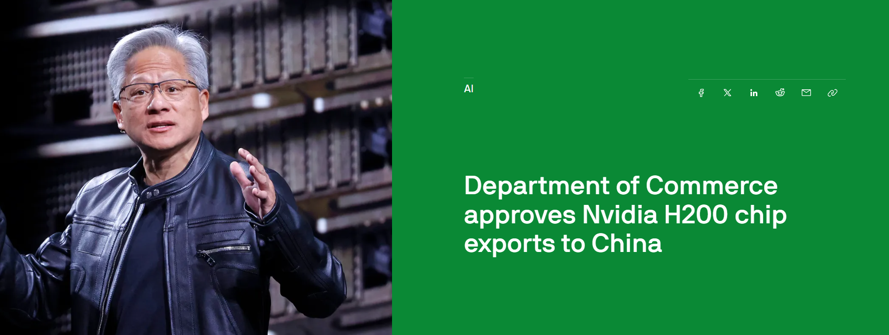 英伟达确认可向中国出售 H200 芯片:美方批准出口并抽成 25%