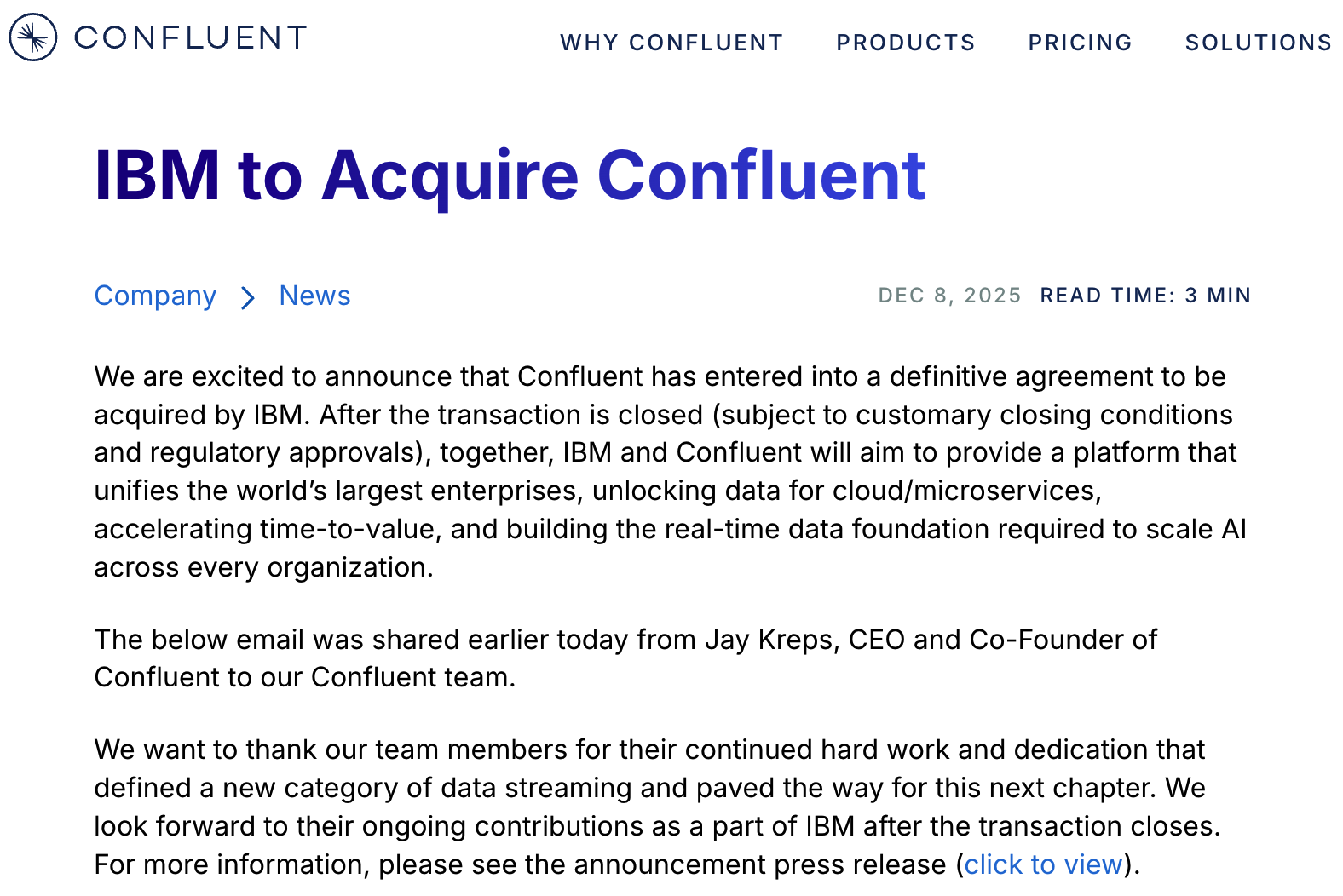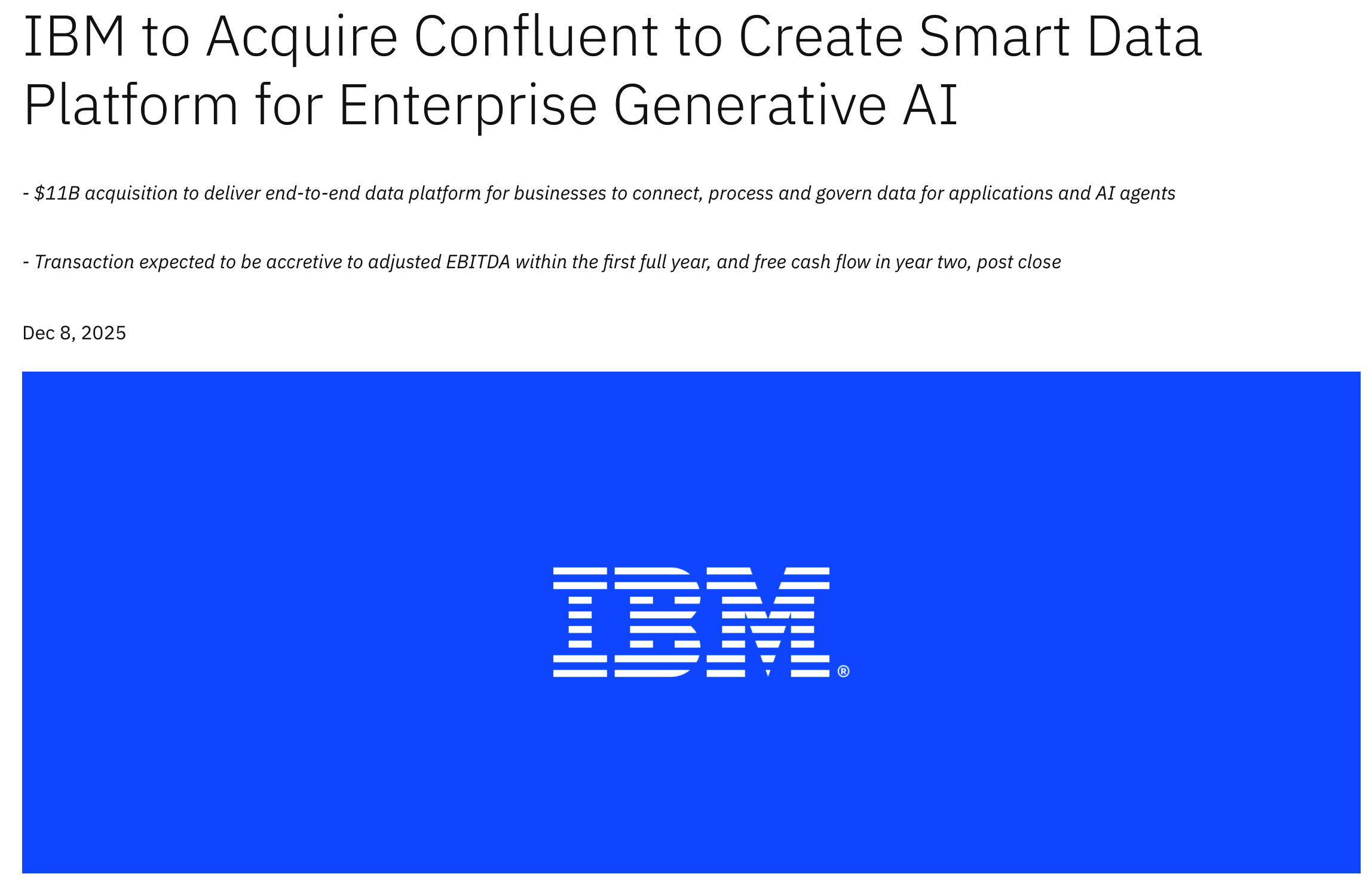 IBM 与 Confluent 官方宣布,双方已签署最终收购协议,IBM 将以每股 31 美元现金、总价约 110 亿美元完全收购实时数据流平台公司 Confluent。交易完成后,Confluent 将作为独立品牌与业务单元并入 IBM。
