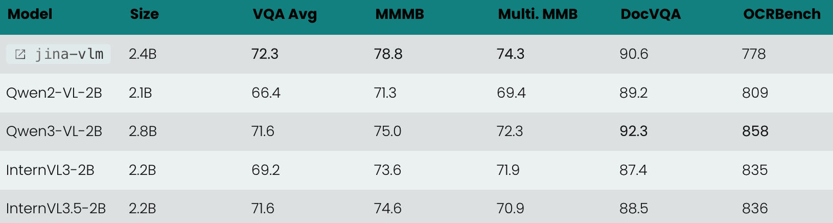 AI 搜索公司 Jina AI 发布了Jina-VLM,这是一个 24 亿参数的视觉语言模型,在开放的 2B 规模 VLM 中实现了最先进的多语言视觉问答。