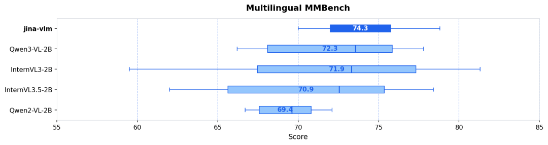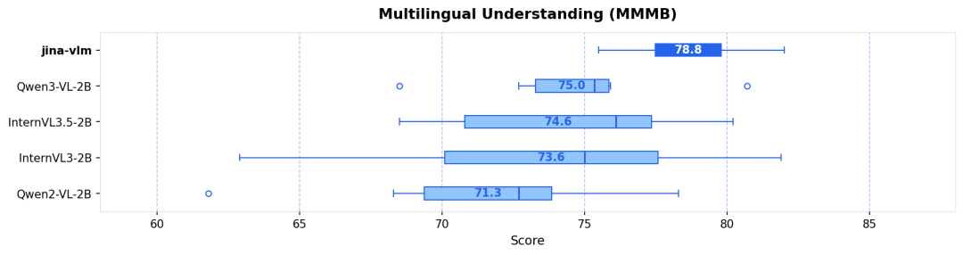 多语言理解 (MMMB SOTA) :在阿拉伯语、中文、英语、葡语、俄语和土耳其语等 6 大语种的测试中,Jina-VLM 以 78.8 分领跑,展现了卓越的跨语言视觉推理能力(见图 1 & 图 2)。