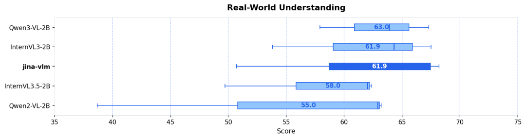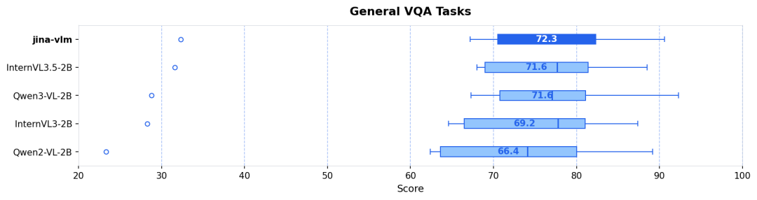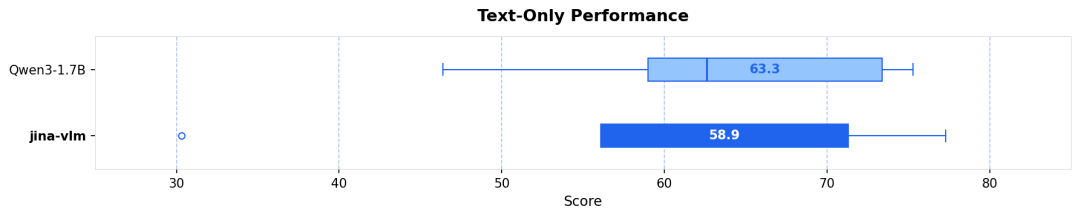 据介绍,在标准的 VQA 任务、多语言多模态理解(MMMB、MMBench),还是在 OCR 和纯文本任务上,Jina-VLM 都是同规格模型里最优级别的表现,且同时具备在消费级硬件友好的推理效率。