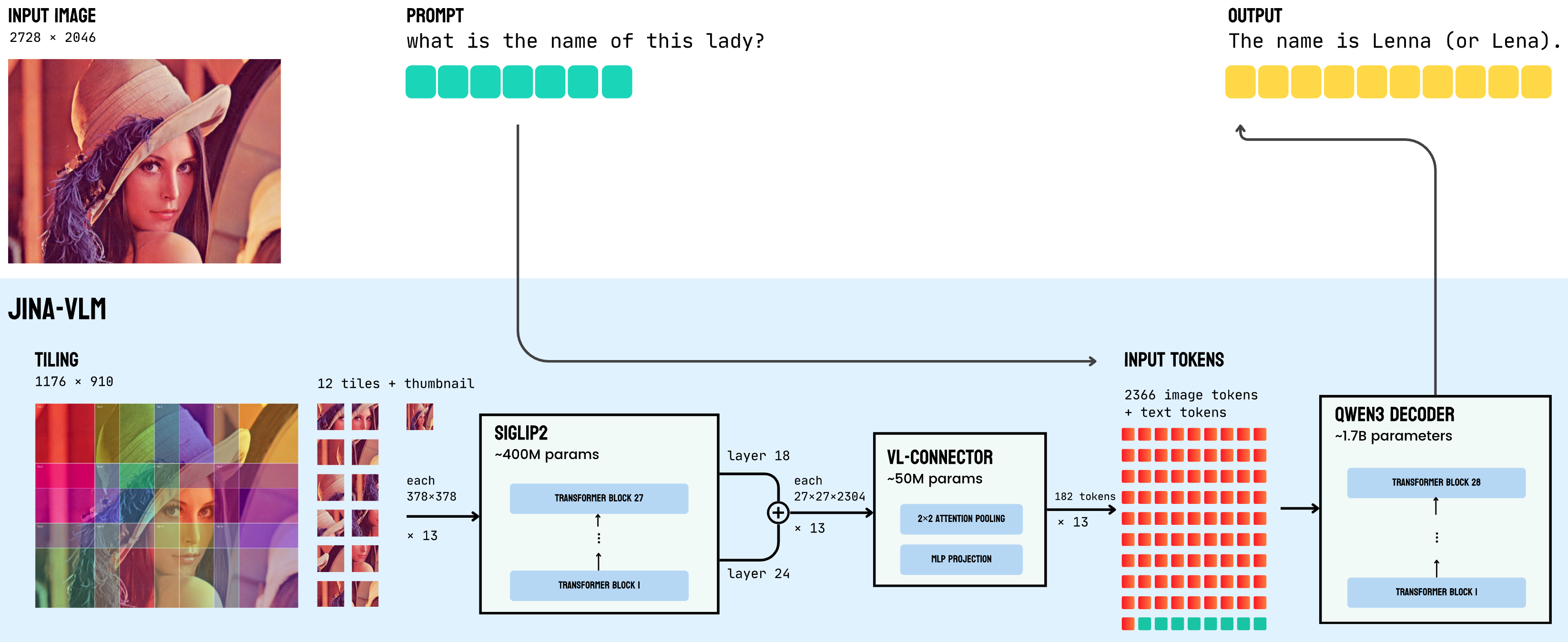 通过将 SigLIP2 视觉编码器与 Qwen3 语言骨干通过注意力池连接器相结合,Jina-VLM 在29 种语言中表现出色,同时保持了足够的效率。Jina-VLM 架构图如下,展示了从 SigLIP2 视觉编码器 → VL-Connector → Qwen3 语言基座的数据流。