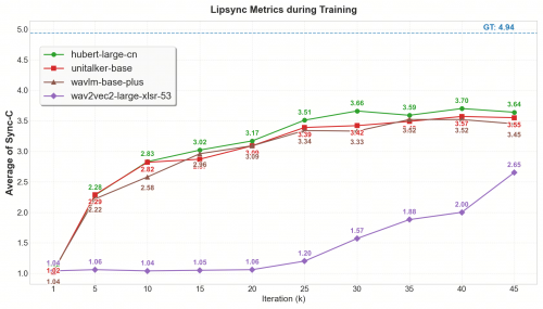 多语言高效同步:在2D数字人生成领域,一些工作沿用了早期的wav2vec2系列的预训练语音编码器来驱动角色。 商汤团队根据在3D数字人语音驱动(UniTalker)中积累的算法经验,发现语音编码器的选择对于数字人驱动效果有极大影响。 为此,研究团队探究了包含wav2vec2, hubert, wavlm, whisper等多种语音编码器在2D数字人驱动中的性能表现, 发现如果沿用wav2vec2系列的语音编码器,即使是多语言预训练的wav2vec2-large-xlsr-53,在英语口型驱动和多语言泛化性上的定量指标中也落后其他编码器。通过细致的消融实验,SekoTalk使用了探究中表现最好的音频编码器,通过规模化的训练,SekoTalk在中英文、多种小语种、日常讲话、说唱等场景中上均取得了准确的驱动效果。