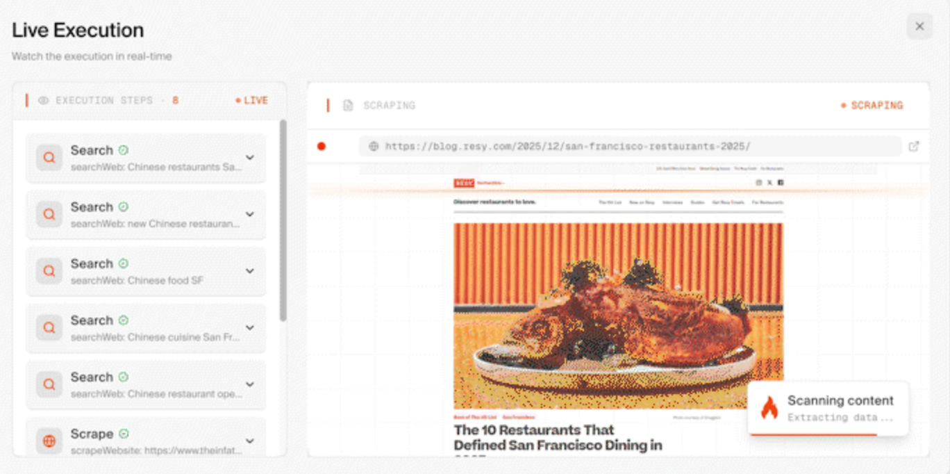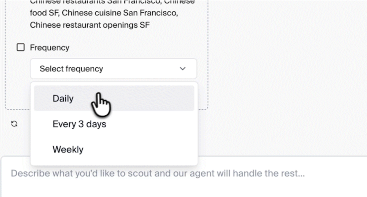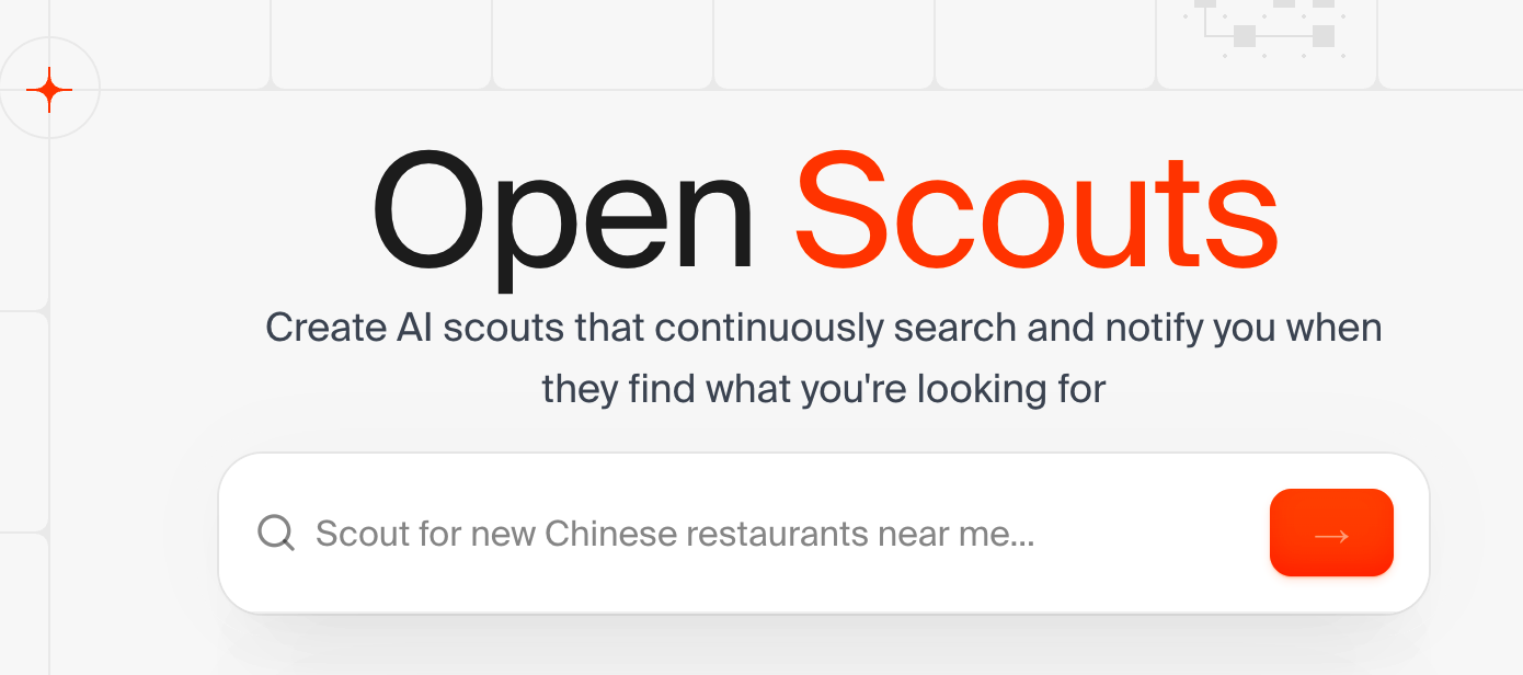 据介绍,用户可以通过定义监控目标来创建 scout,例如监控附近新开餐厅或追踪 AI 新闻,系统会自动配置搜索策略。