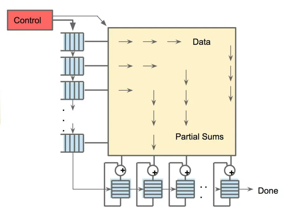 - 其核心组件是矩阵乘法单元(Matrix Multiply Unit) ------ 一个巨大的 256×256 乘加单元(MAC)阵列,采用脉动阵列(systolic array)结构,数据以"波"的形式在网格中流动。