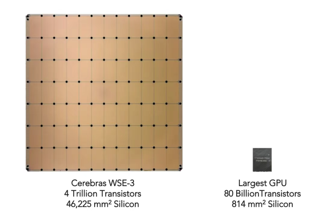 Cerebras 将未来押注于晶圆级芯片。其最新款 Cerebras WSE-3 芯片实际上是史上尺寸最大的 AI 芯片之一 ------ 面积高达 46,255 mm²。其核心技术在于:Cerebras 将整片硅晶圆直接制成一颗芯片,而不是像传统 CPU 或 GPU 那样将晶圆切割成数百个小处理器。