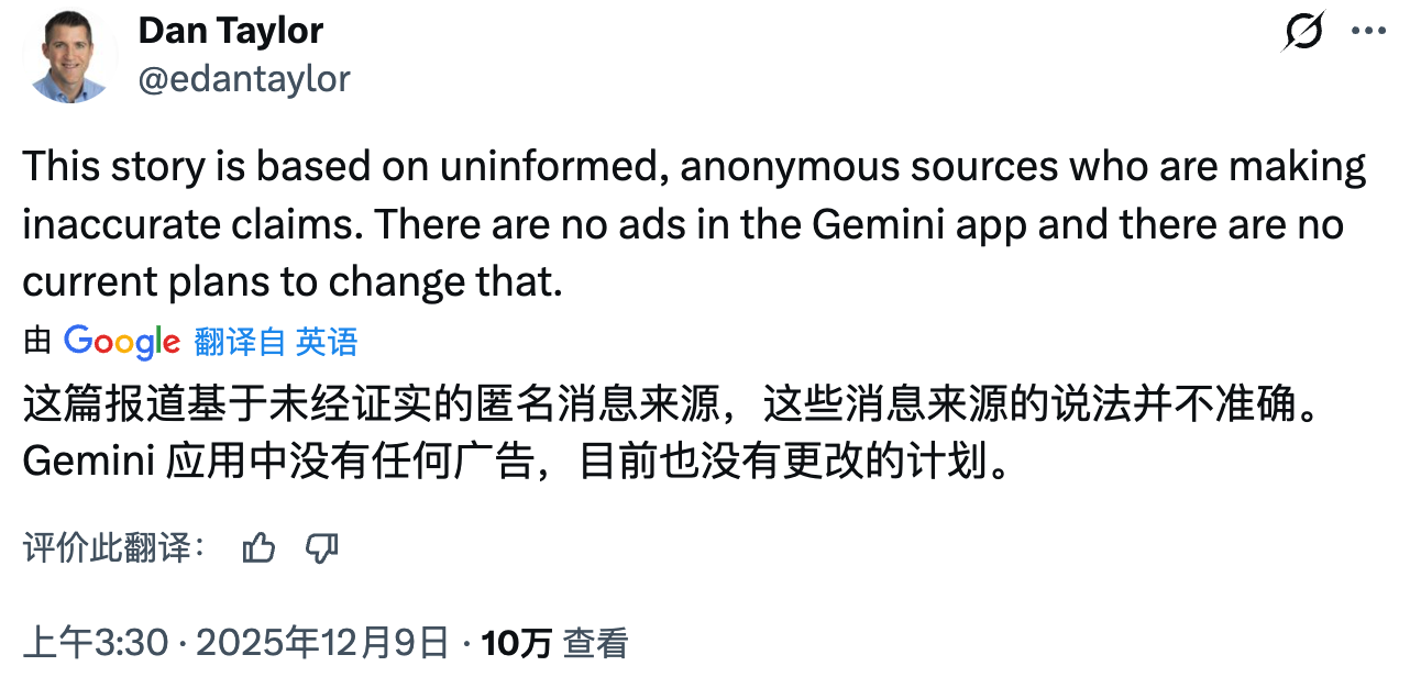 谷歌全球广告副总裁 Dan Taylor 在社交平台 X 上明确指出,Gemini 应用中没有广告,公司也没有任何改变这一现状的计划。他强调,外界关于广告即将进入 Gemini 的传言并不属实。