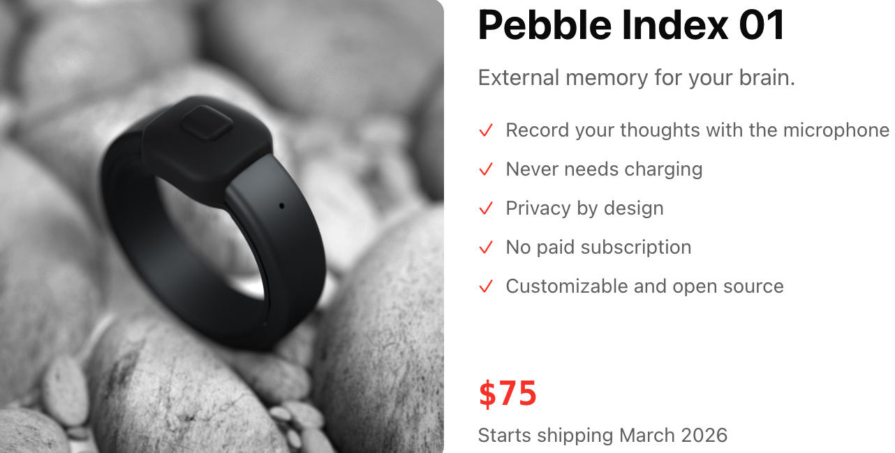 继重启 Pebble 智能手表后,Pebble 创始人 Eric Migicovsky 近日宣布推出名为 Index 01 的 AI 智能戒指,定价 75 美元。该设备定位为“用户的外部记忆”,主打语音笔记功能,通过内置麦克风与按钮,将录音传输至手机并利用 AI 转换为文本。