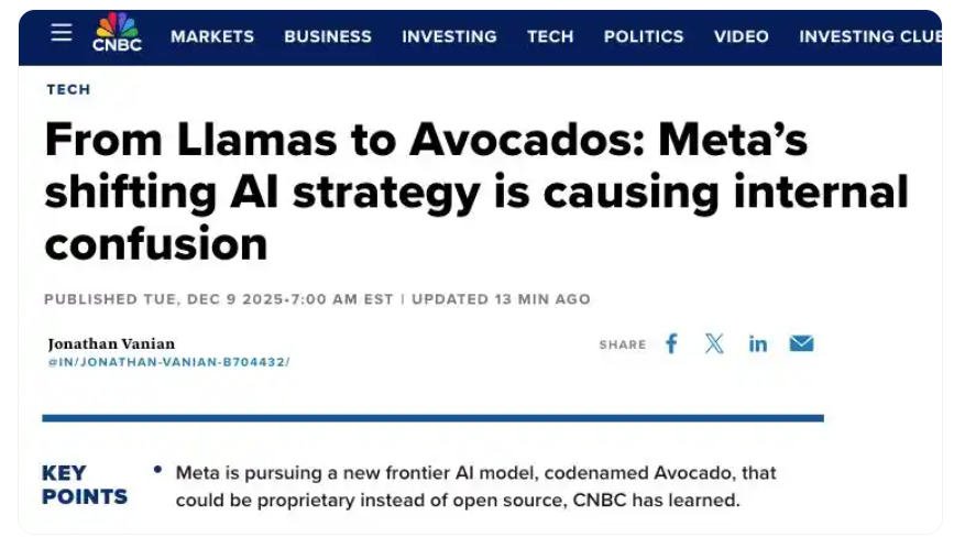 CNBC 消息称,Meta正悄然布局人工智能领域的新棋局,其正在研发一款代号为“Avocado”(牛油果)的全新前沿人工智能模型。有消息指出,该模型大概率将采用专有模式,而非开源形式。