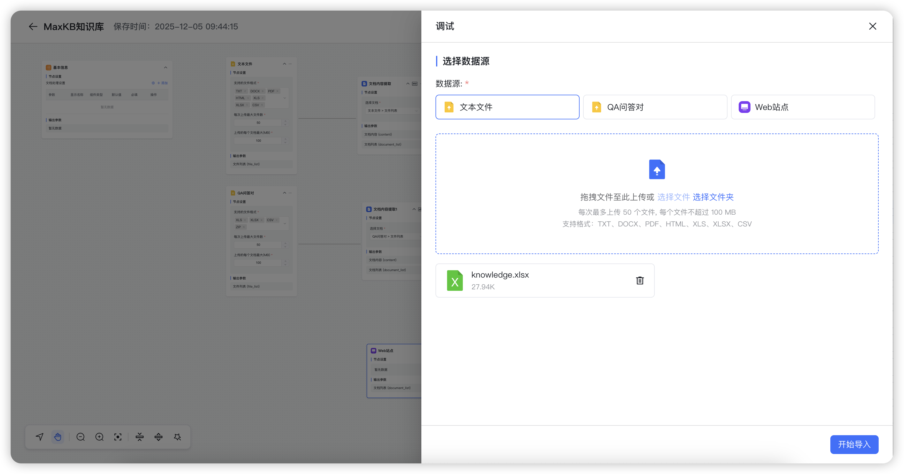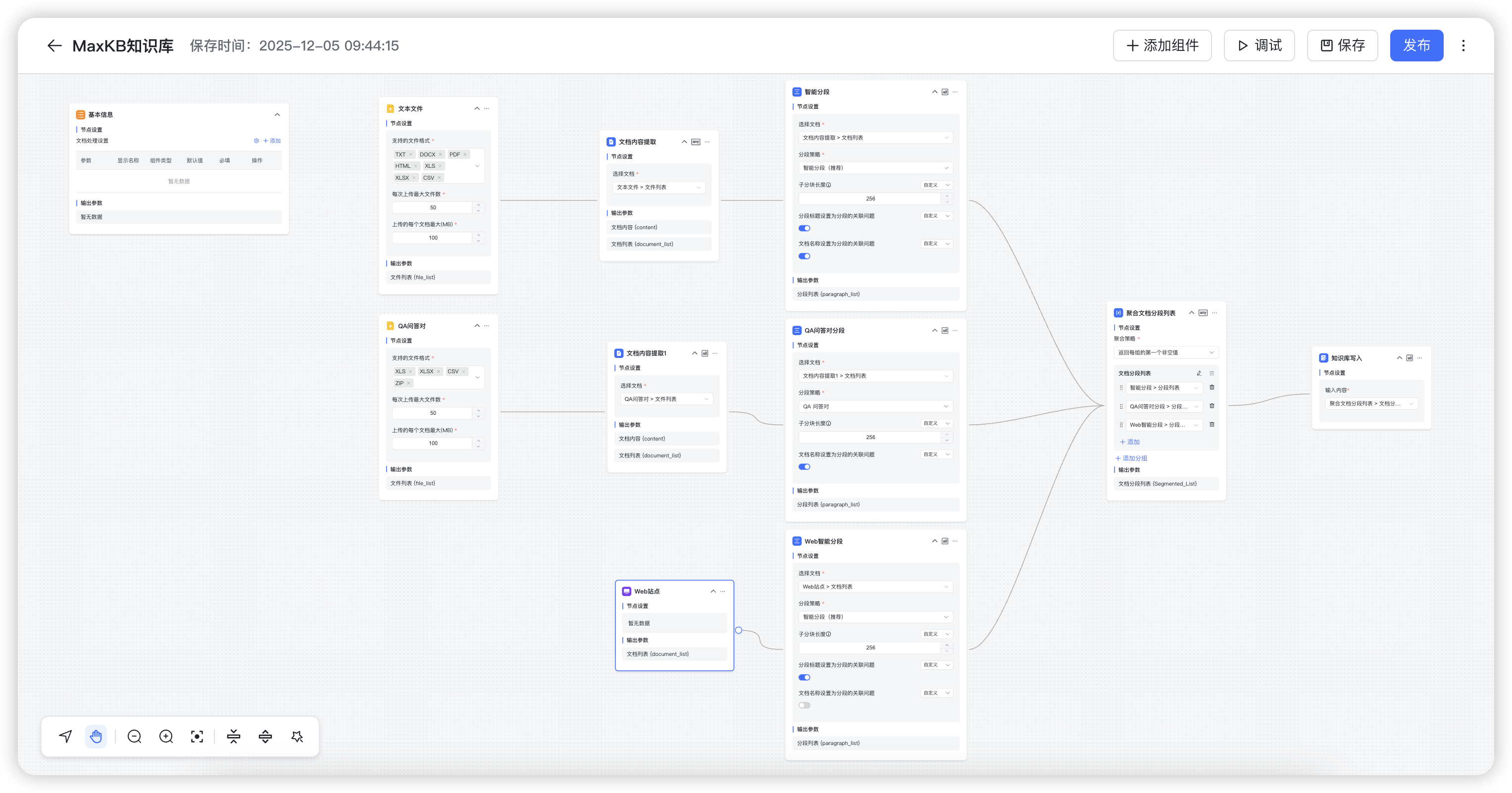 MaxKB v2.4.0 社区版新增工作流知识库功能,允许用户通过拖拽节点的方式自主编排从不同数据源导入到知识库写入的全流程,满足企业个性化知识管理需求。工作流知识库的使用步骤为:创建工作流知识库→编排工作流→调试并发布工作流→导入文档。以下是每个步骤的详细介绍: