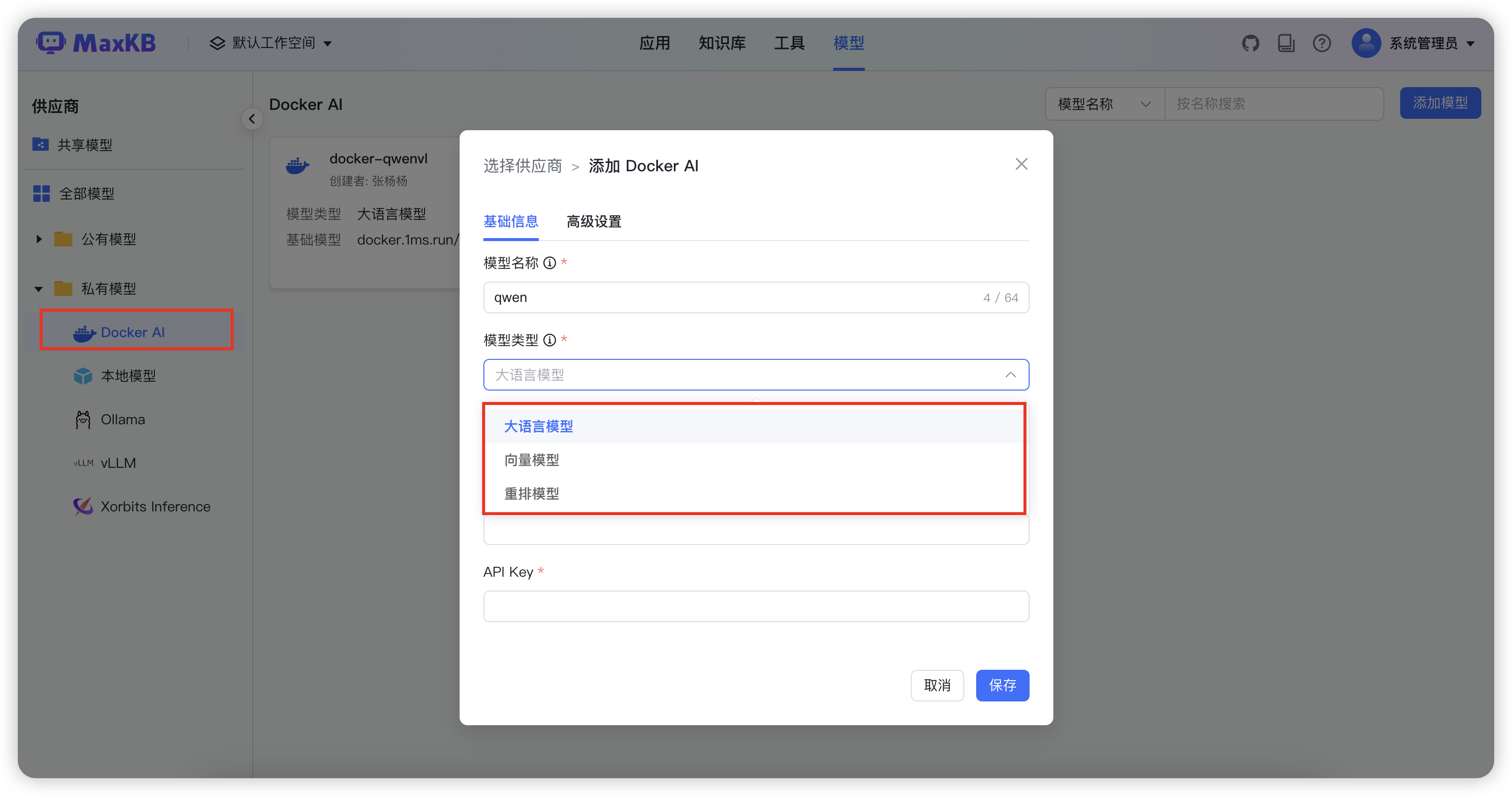 ▲图 9 MaxKB 新增支持 Docker AI 模型供应商