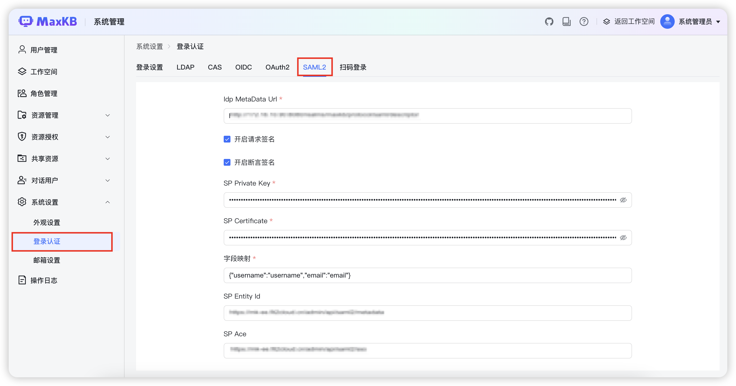 X-Pack 增强包方面,系统设置的登录认证新增对 SAML2 单点登录的支持。目前,MaxKB 已经全面兼容主流单点登录协议,包括 CAS、OIDC、LDAP、OAuth2 和 SAML2。