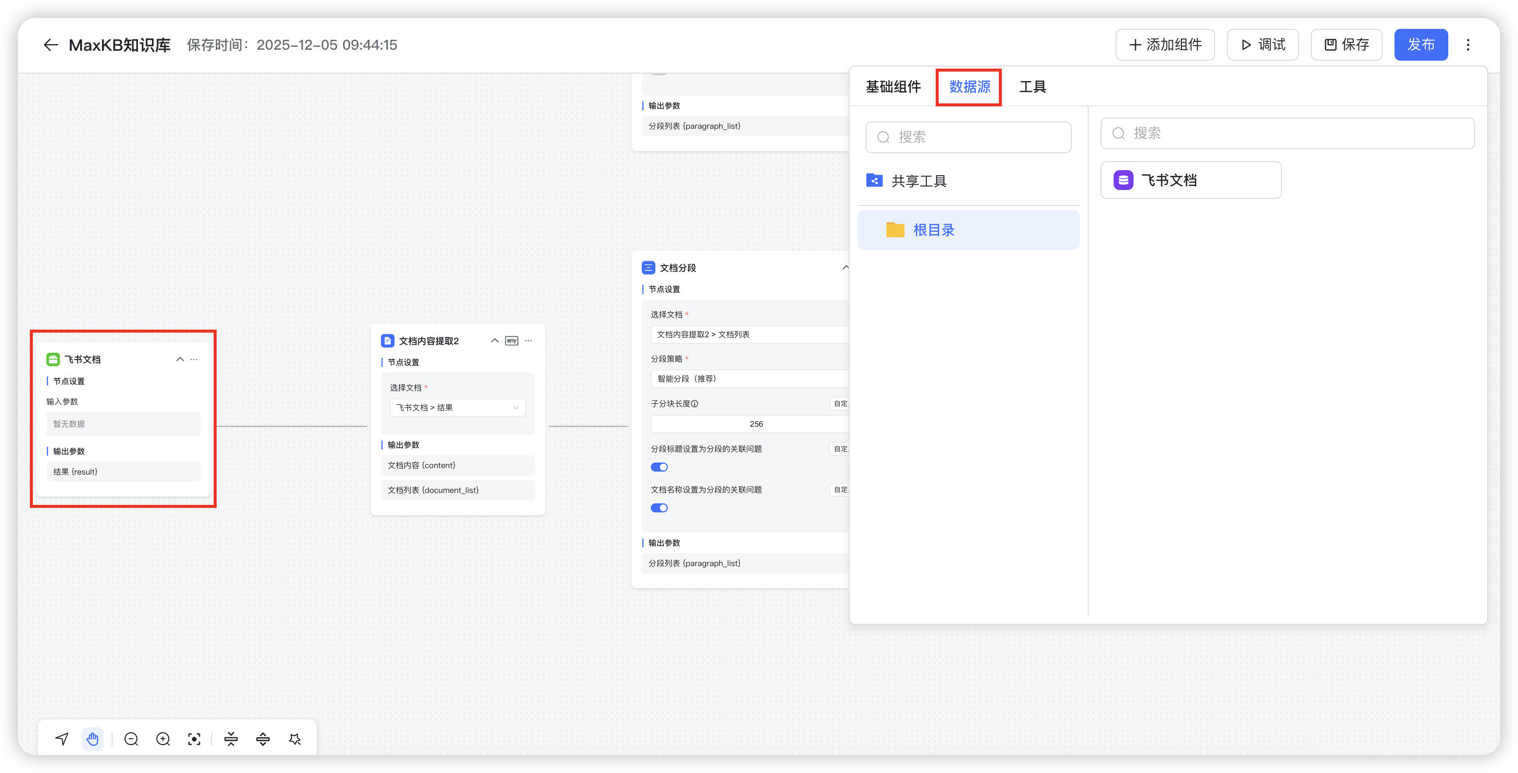 数据源:作为工作流的起始节点,支持 “内置 + 工具扩展” 双模式,系统默认支持本地文件与 Web 站点两类数据源,支持通过数据源工具接入其他企业级数据源(例如企业微信文档、钉钉文档等,现已支持飞书数据源工具),用户只需按照规范开发数据源工具,即可接入工作流,无需等待系统版本更新。