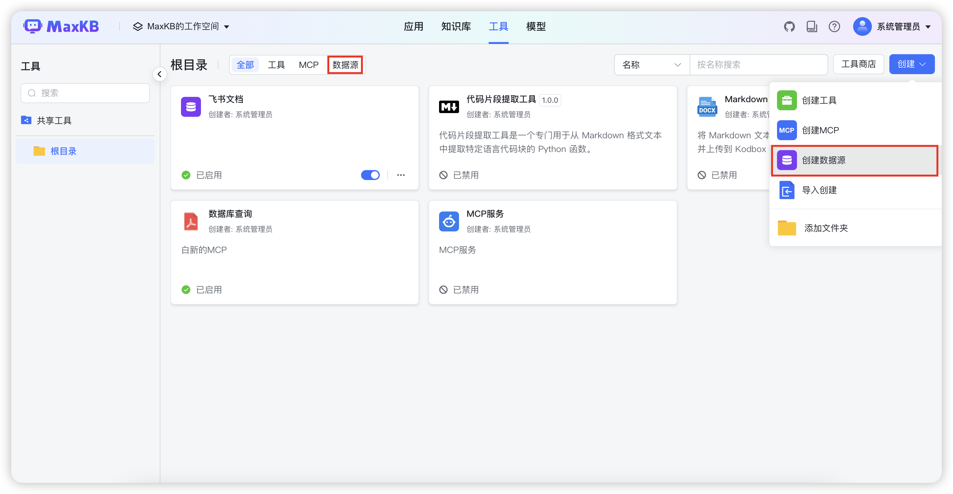 在 MaxKB v2.4.0 社区版中,新增数据源工具支持,用户只需要按照规范开发数据源工具并启用,即可将其接入工作流知识库,打破了以往依赖官方新增知识库类型的限制,拓宽了 MaxKB 的知识库接入能力。
