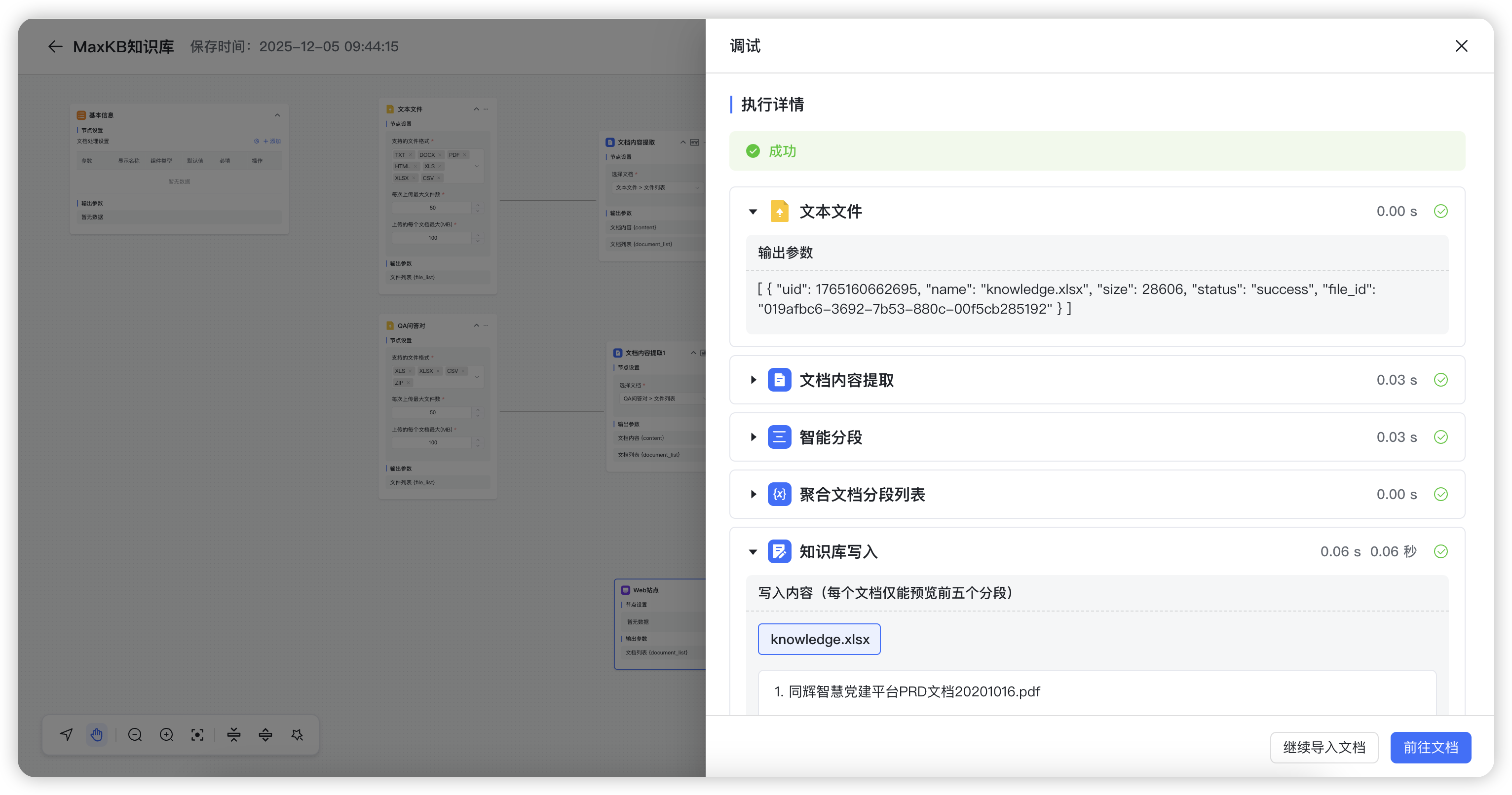 编排完成后,点击工作流知识库页面的 “调试” 按钮,系统将按流程执行。用户可在 “执行详情” 对话框中可查看各节点的运行状态,例如数据源是否成功获取文档、解析工具是否正常提取内容、分段结果是否符合预期、写入是否成功等。调试无误后,点击 “发布” 按钮,使该工作流将正式生效。