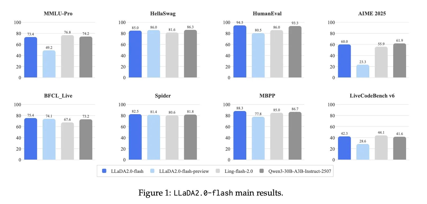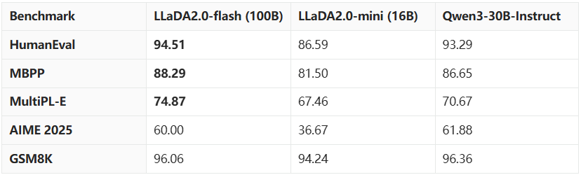 蚂蚁技术研究院在知识理解、数学、代码、推理 & 智能体等多个维度对模型进行了评估。结果显示,LLaDA2.0 在结构化生成任务(如代码)上具有显著优势,并在其他领域与开源 AR 模型持平。