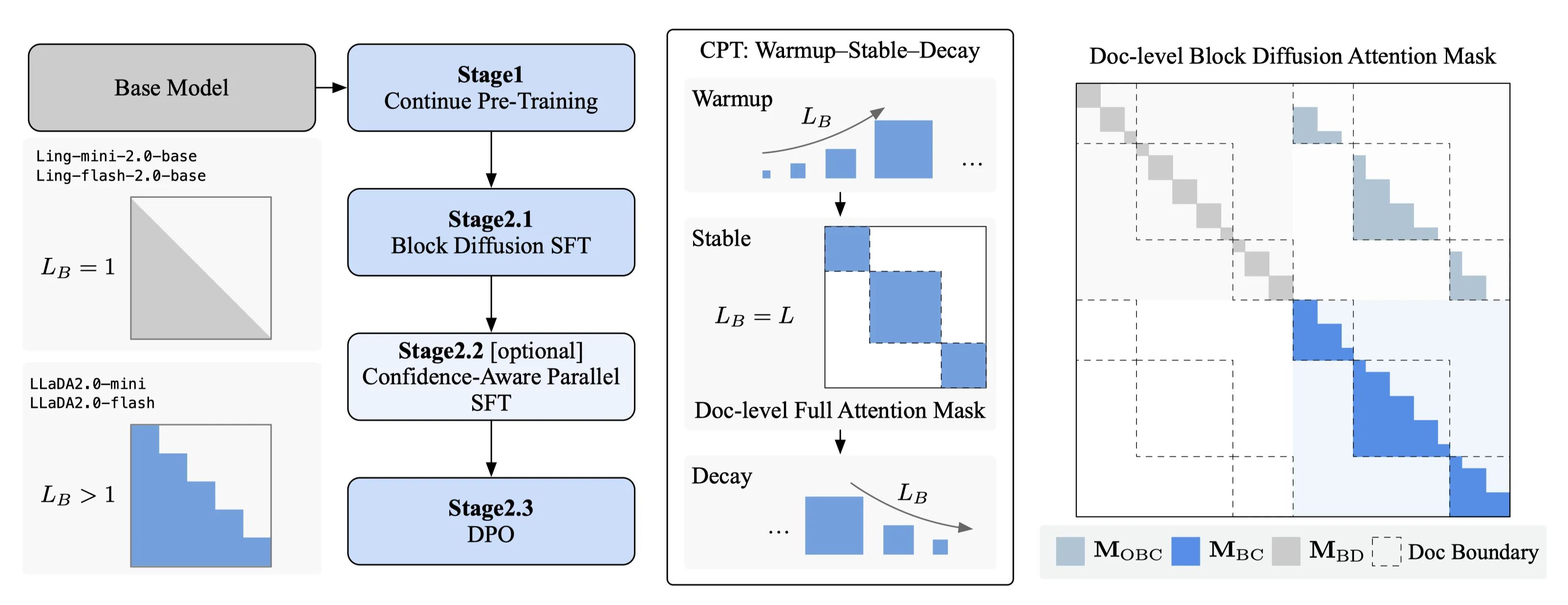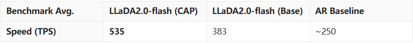 通过创新的 Warmup-Stable-Decay(WSD)持续预训练策略,LLaDA2.0 能够无缝继承现有 AR 模型的知识,避免了从头训练的高昂成本。结合不仅限于常规 SFT 的 置信度感知并行训练(CAP)和 扩散模型版 DPO,LLaDA2.0 在保证生成质量的同时,利用扩散模型的并行解码优势,实现了相比 AR 模型 2.1 倍的推理加速,证明了在超大规模参数下,扩散模型不仅可行,而且更强、更快。