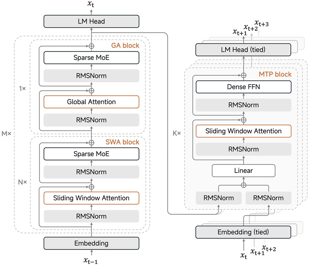 采用 5:1 的 Sliding Window Attention (SWA) 与 Global Attention(GA)混合结构,128 窗口大小,原生 32K 外扩 256K 训练。经前期大量实验发现,SWA 简单、高效、易用,展现了比主流 Linear Attention 综合更佳的通用、长文和推理能力,并提供了固定大小的 KV Cache 从而极易适配现有训练和推理 Infra 框架。