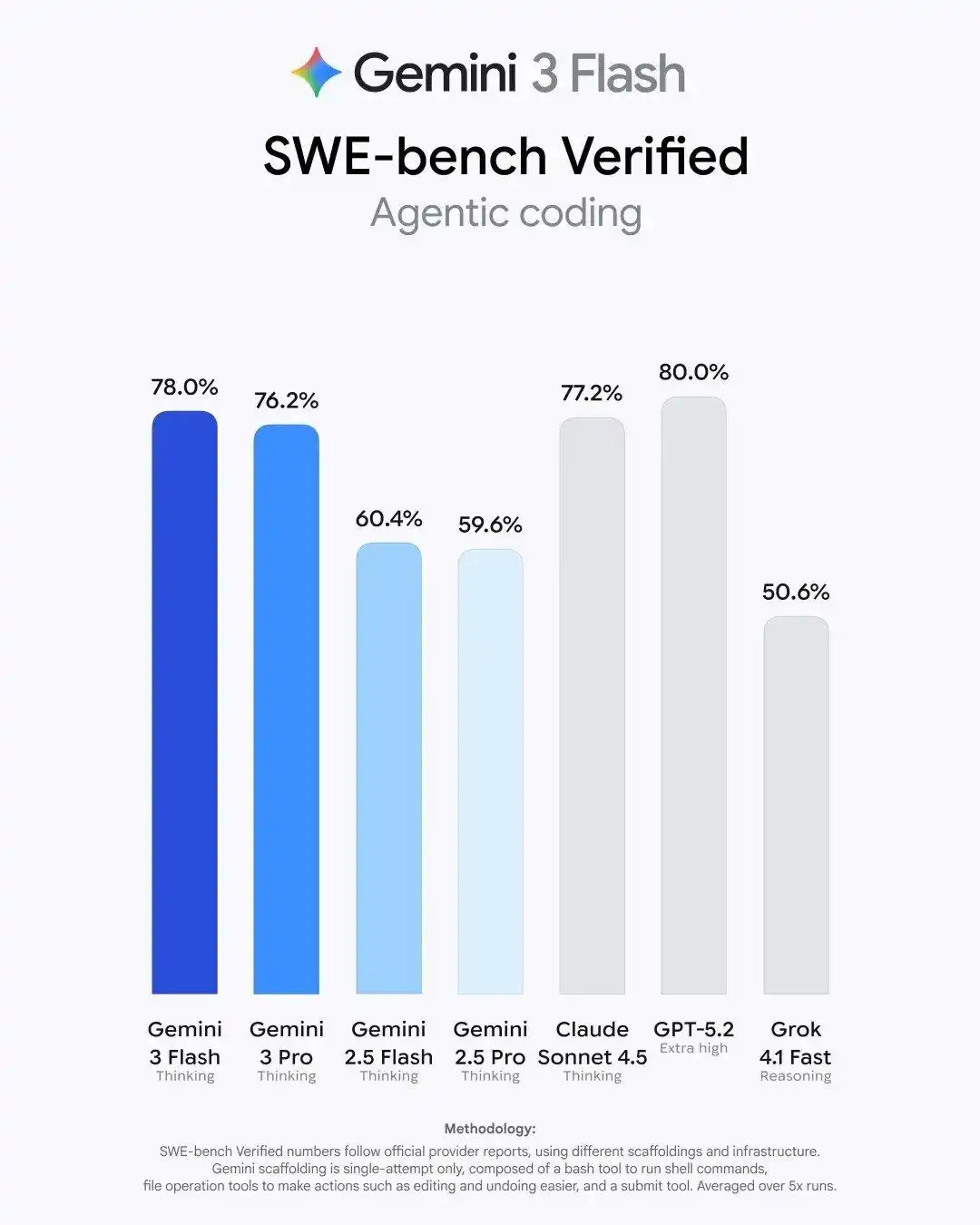 在 SWE-bench Verified 基准测试中,Gemini 3 Flash 的解决率达到 78%,仅次于 GPT-5.2 的 80%,不仅超越 Gemini 2.5 系列,甚至优于同门的 Gemini 3 Pro,Pro 的准确率为 76.2%。