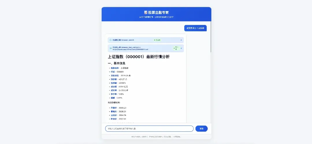 我们基于此能力打造了"金融股票专家"应用:用户输入股票名称或代码,Agent 自动打开财经网站,抓取最新行情、财报摘要与新闻舆情,综合分析后生成投资建议。