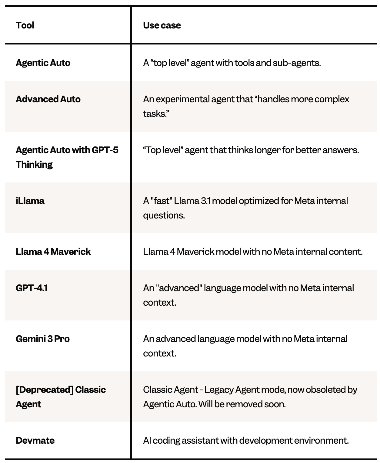 从曝光的名单里显示,Meta 目前已经允许 GPT-5、GPT-4.1、Gemini 3 Pro、Claude 等 AI 模型,甚至连 Google 的 NotebookLM Pro 也在内部使用。