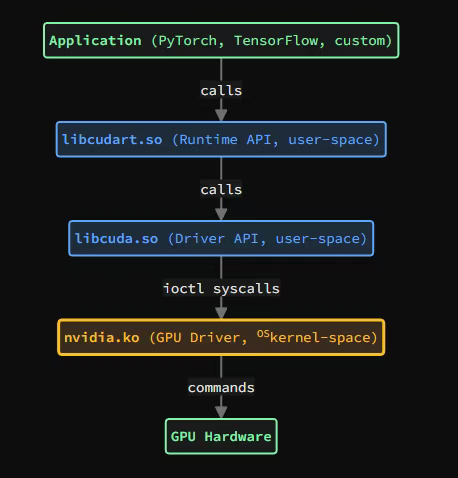 1)NVIDIA GPU Driver(也称 "NVIDIA Display Driver"):运行在(OS)kernel 空间的驱动程序(Linux 上为(OS)kernel 模块,Windows 上为(OS)kernel 驱动),用于管理 GPU 硬件。尽管历史上被称为"显示驱动",但这个统一的驱动实际上处理了所有 GPU 操作:图形渲染、计算任务、内存管理与调度。该名称反映了 NVIDIA 从专注于图形的 GPU 向通用计算加速器的演进过程。