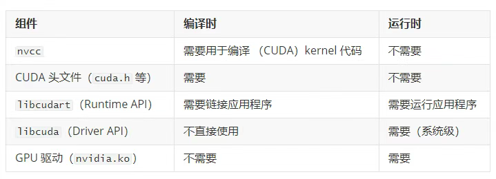 - 运行时需要运行时库(libcudart),但不需要 nvcc 和头文件。