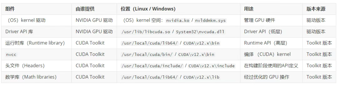 - 其版本与 GPU 驱动程序版本绑定(例如,driver 535.x 提供支持 CUDA Driver API 12.2 的 libcuda.so/nvcuda.dll)。