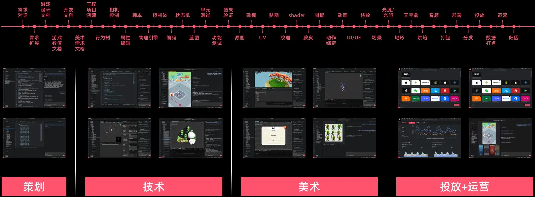 各位开发者深刻地了解,游戏开发远远不只是像 Coding 工作,游戏的流水线要漫长得多。从策划文档、美术资源(原画/建模/骨骼/UI)、场景搭建,到最头疼的打包构建、多平台分发、数据运营,这条流水线往往是割裂的。