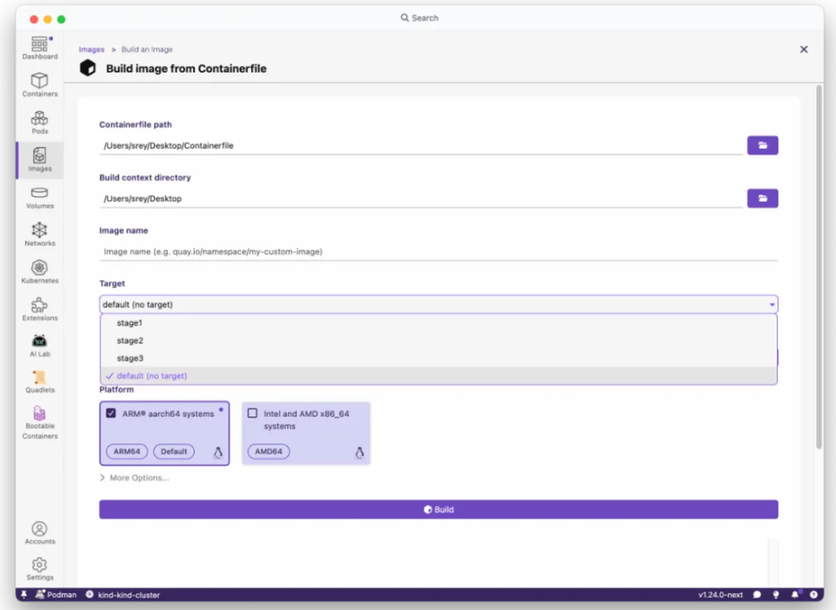 针对 Containerfile 中多目标构建,现在更简单。在“构建镜像”页面,Podman Desktop 会自动检测可用阶段,并新增下拉菜单选择构建目标。此功能等同于 Podman CLI 的 --target 选项,简化复杂多阶段构建流程。