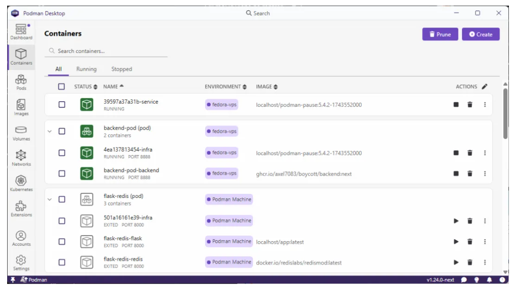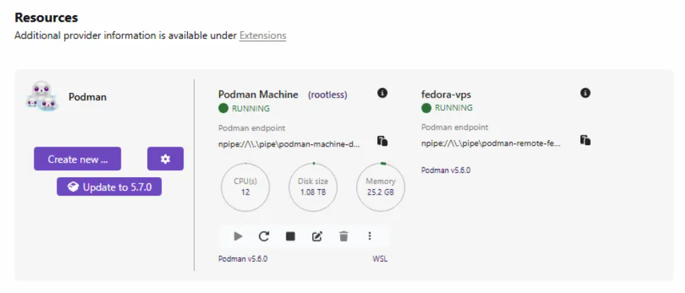 在处理多个连接(如 Podman Remote)时,界面将帮助区分资源。例如,容器列表的环境栏现在显示 Podman 连接名称,更容易识别不同端点的资源。