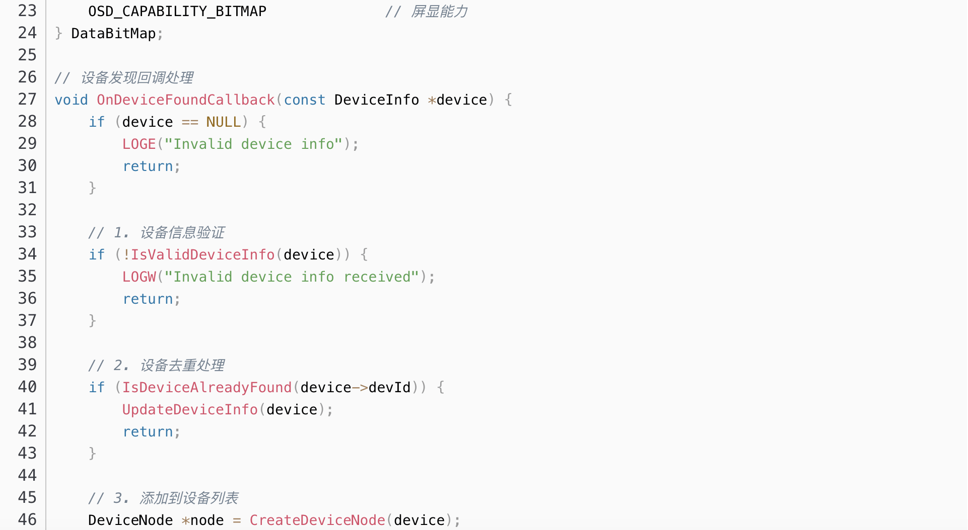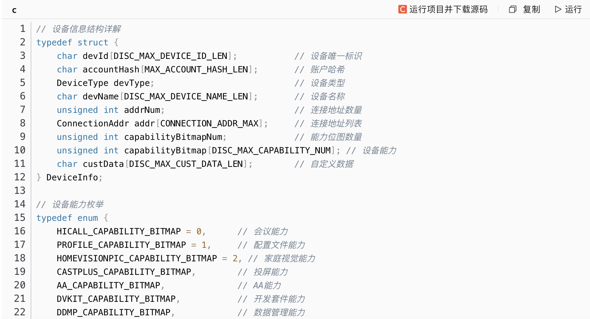 设备信息通过DeviceInfo结构体进行统一管理,包含设备ID、类型、能力等关键信息。