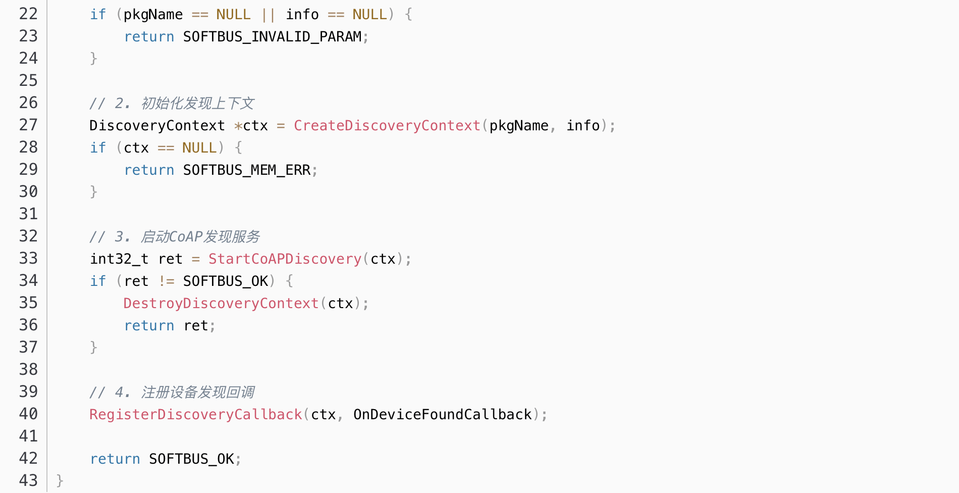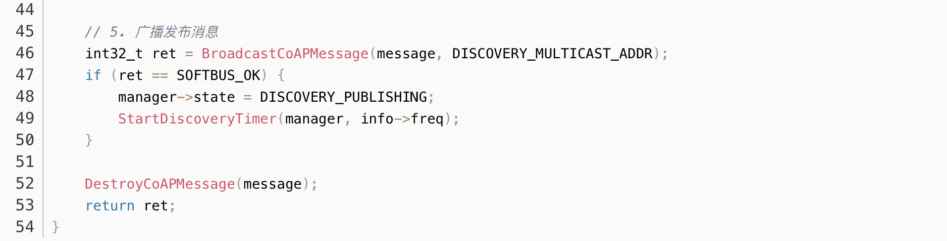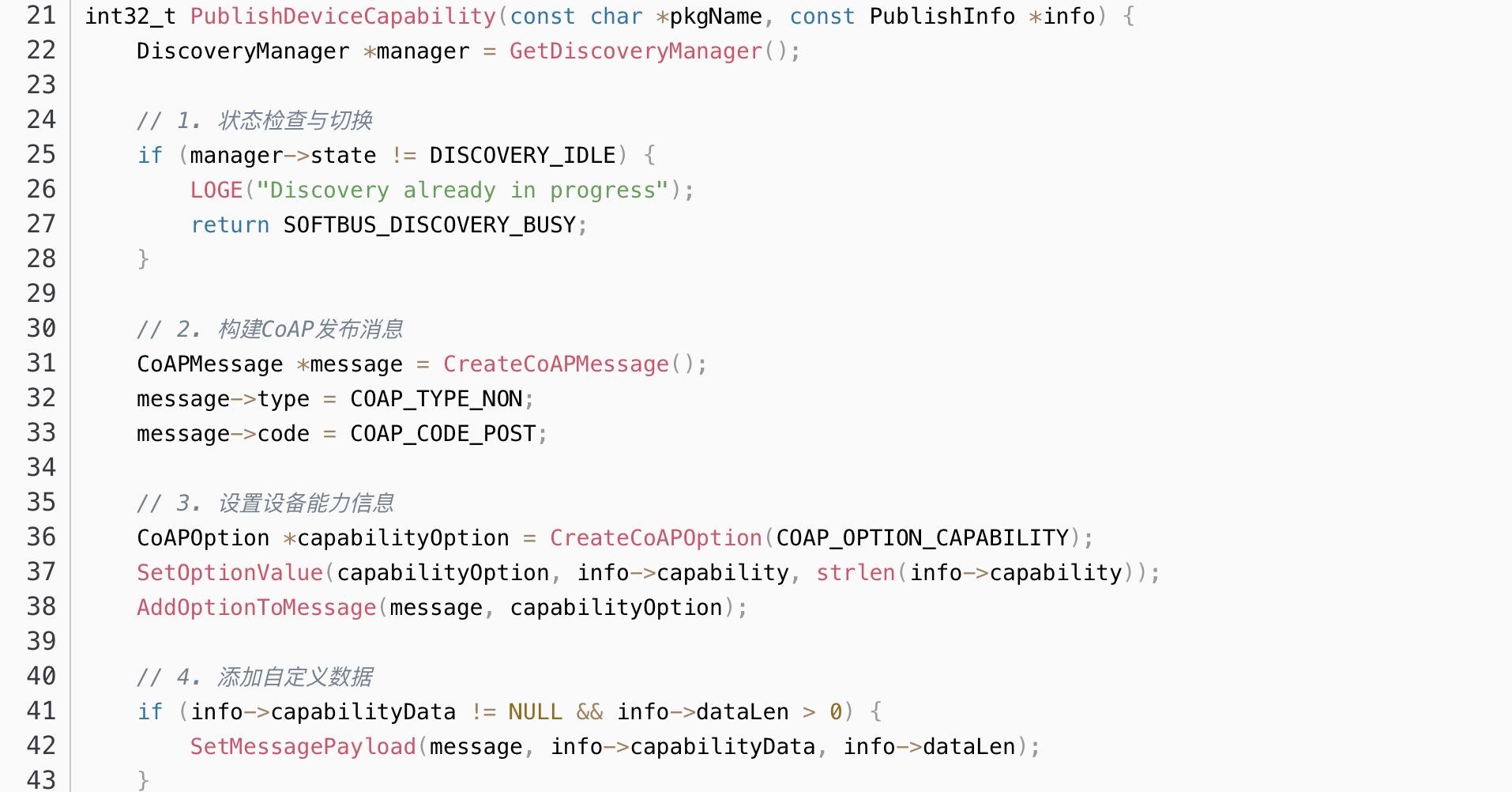 设备发现是分布式软总线的基础功能,采用基于CoAP协议的轻量级发现机制。CoAP协议具有较低的开销,适用于HarmonyOS支持的各种设备。