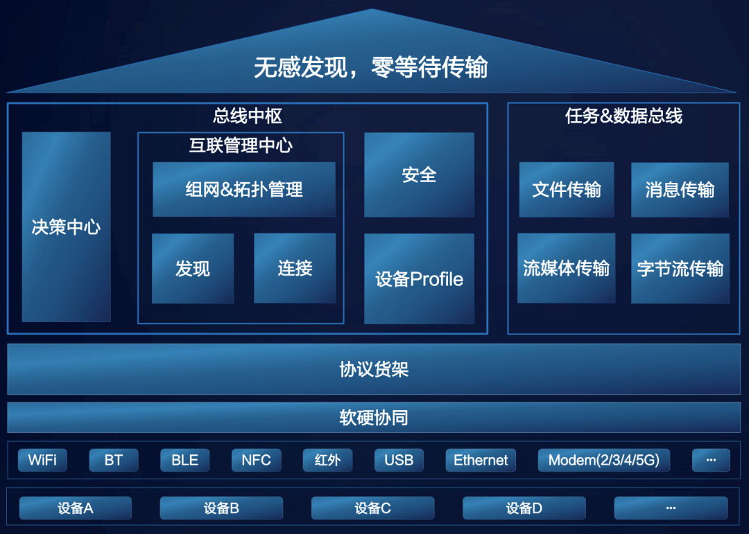 HarmonyOS分布式软总线的出现,正是为了解决这些痛点。它实现了近场设备间统一的分布式通信管理能力,提供不区分链路的设备间发现连接、组网和传输能力。