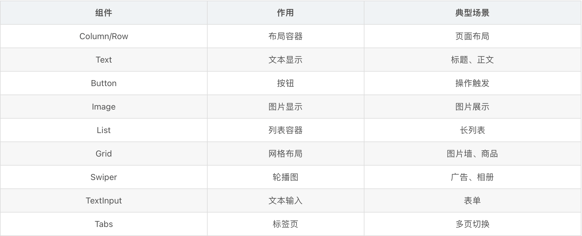 · 布局用 Column/Row,列表用 List,表单用 TextInput