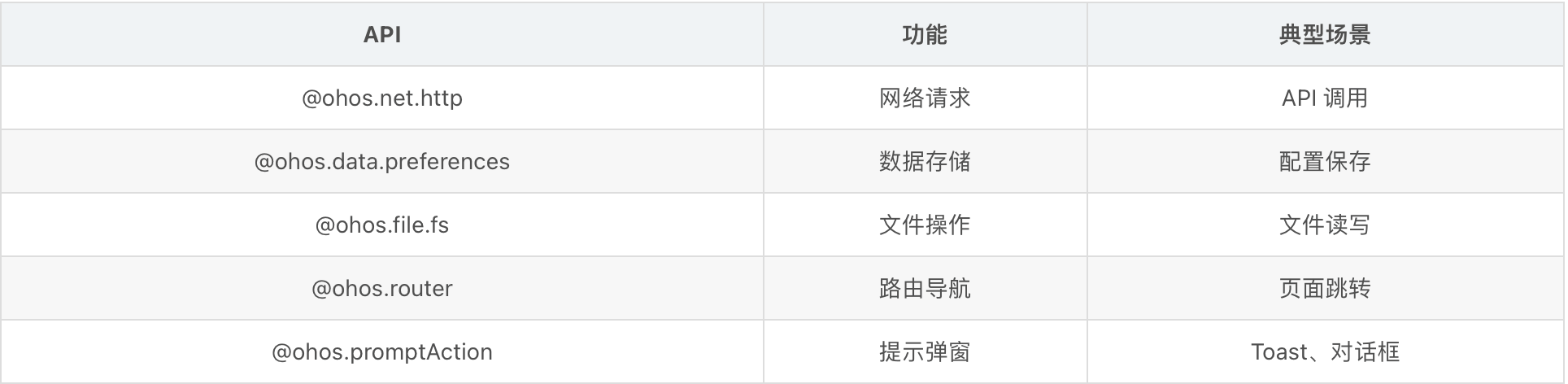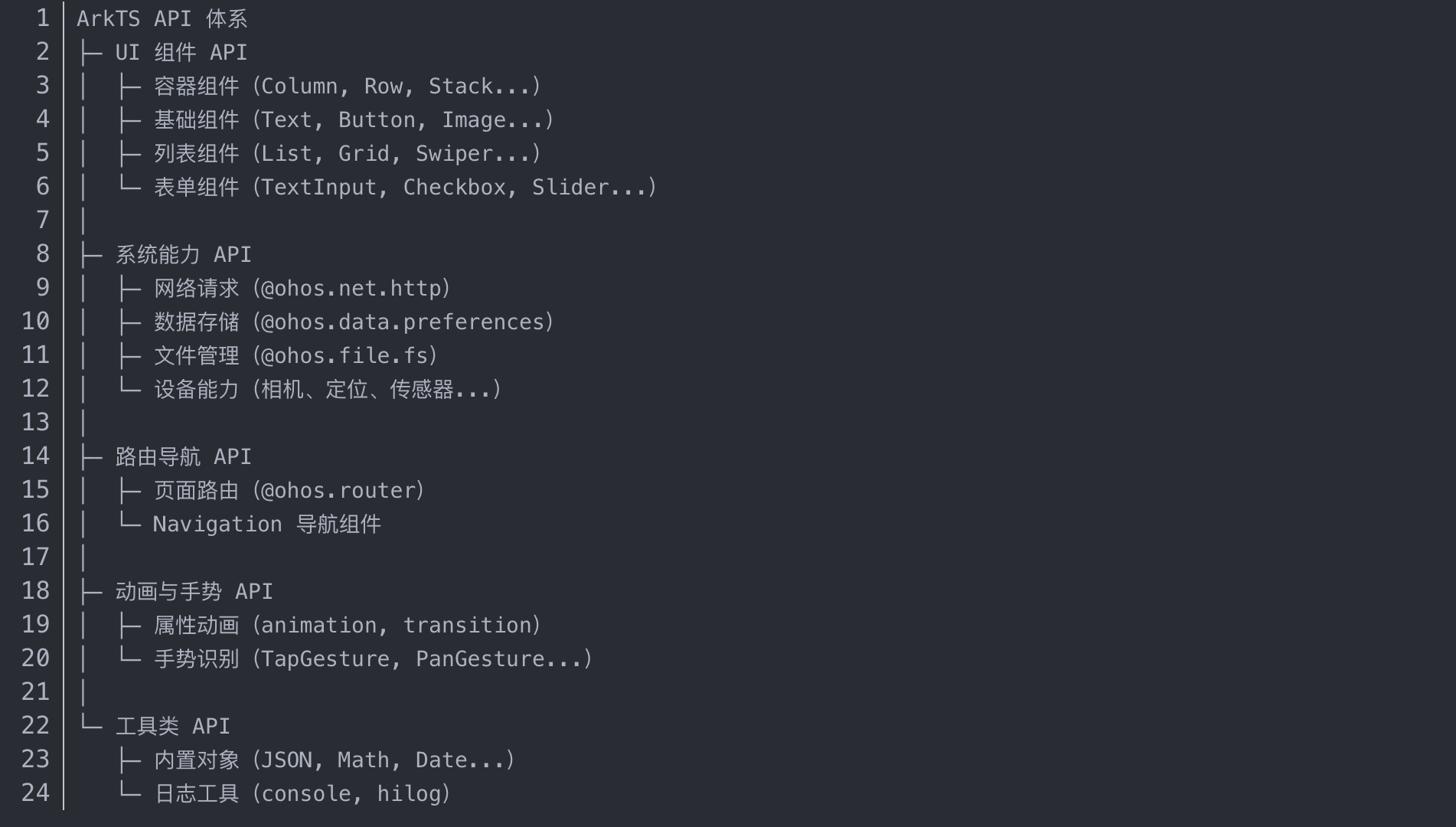 ArkTS API 是鸿蒙应用开发的核心工具集,涵盖 UI 组件、系统能力、工具类等。
