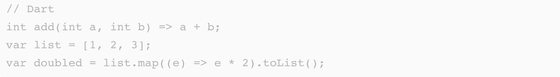 Dart: 对于只有一个表达式的函数,可以使用箭头语法 =>。它隐含了 return。