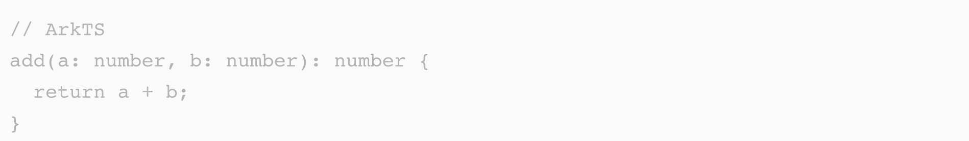 ArkTS: 语法更接近 TypeScript,使用 ? 标识可选参数,并可直接在参数列表中赋默认值。