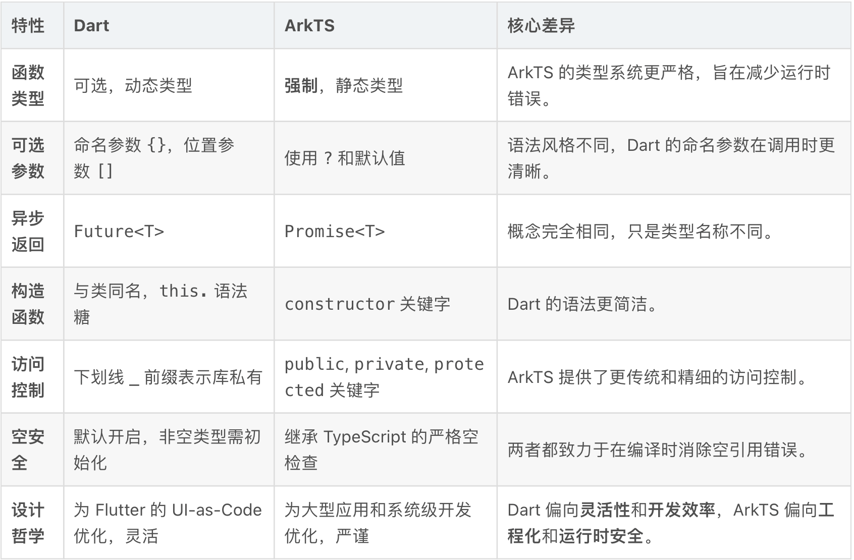Dart 和 ArkTS 都是现代、响应式的语言,分别作为 Flutter 和 HarmonyOS 应用开发的核心。它们在语法上颇有相似之处(都受到 C++、Java、JavaScript/TypeScript 家族的影响),但在设计哲学和具体实现上又各有侧重。理解它们在函数和类上的差异,是高效进行跨平台学习的关键。