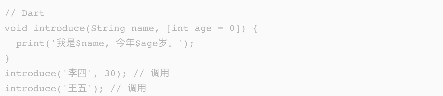 命名可选参数: 使用 {} 包裹,调用时使用 paramName: value 的形式。