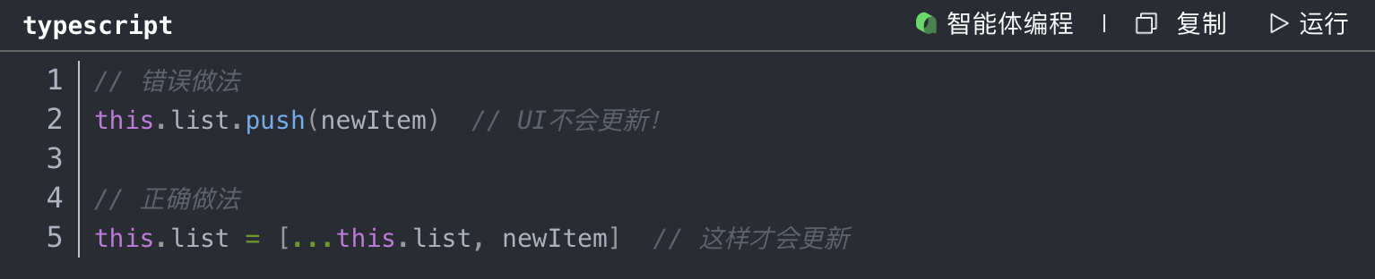 第一个坑是修改数组的问题。有一次我直接用push往数组里加数据,结果UI死活不更新。debug了好久,后来才知道,@State修改数组要用整体替换: