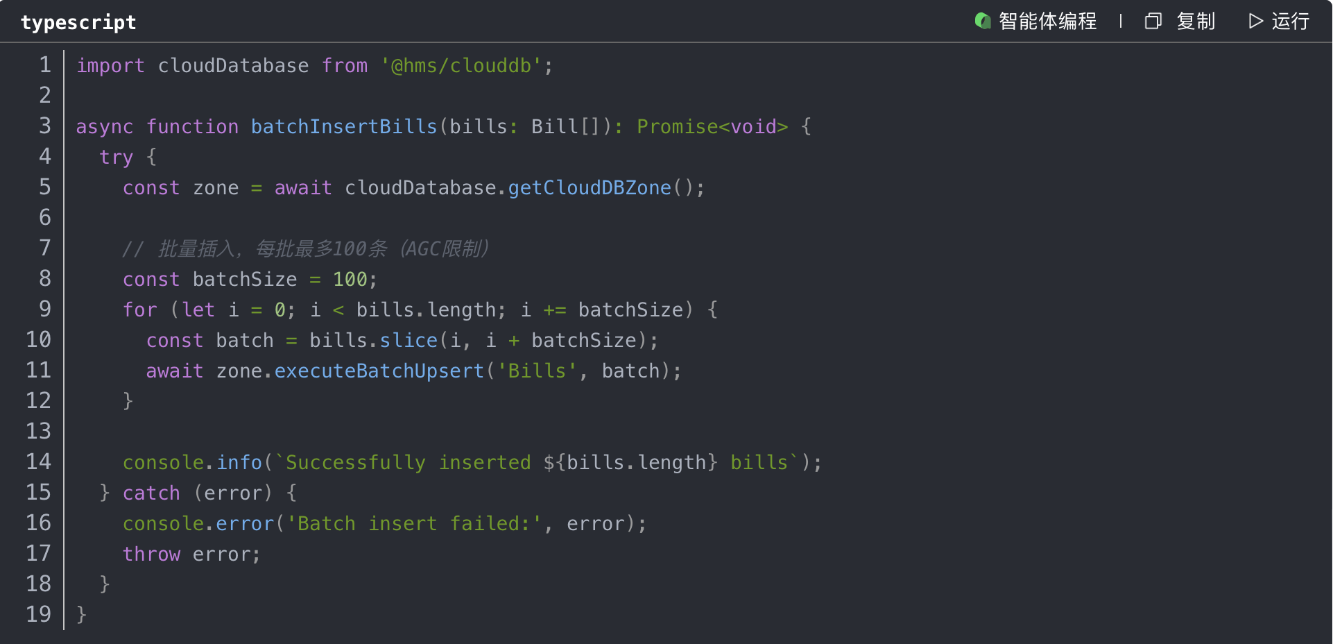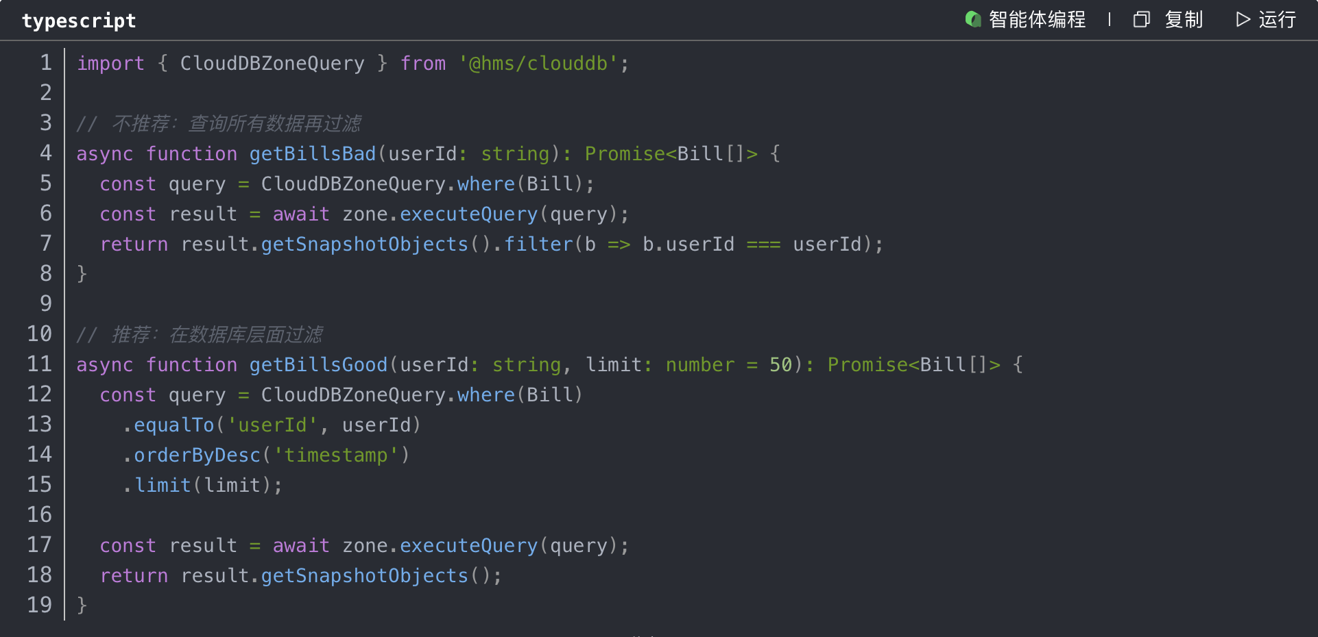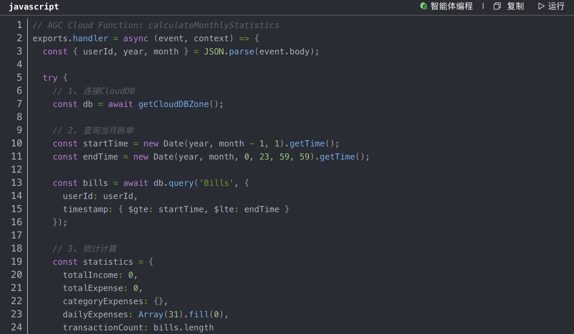 虽然CloudDB强大,但复杂的统计查询放在客户端执行会消耗大量性能。我们使用Cloud Functions在服务端进行统计。