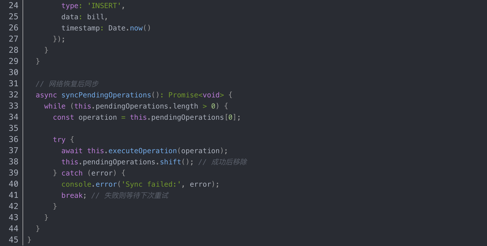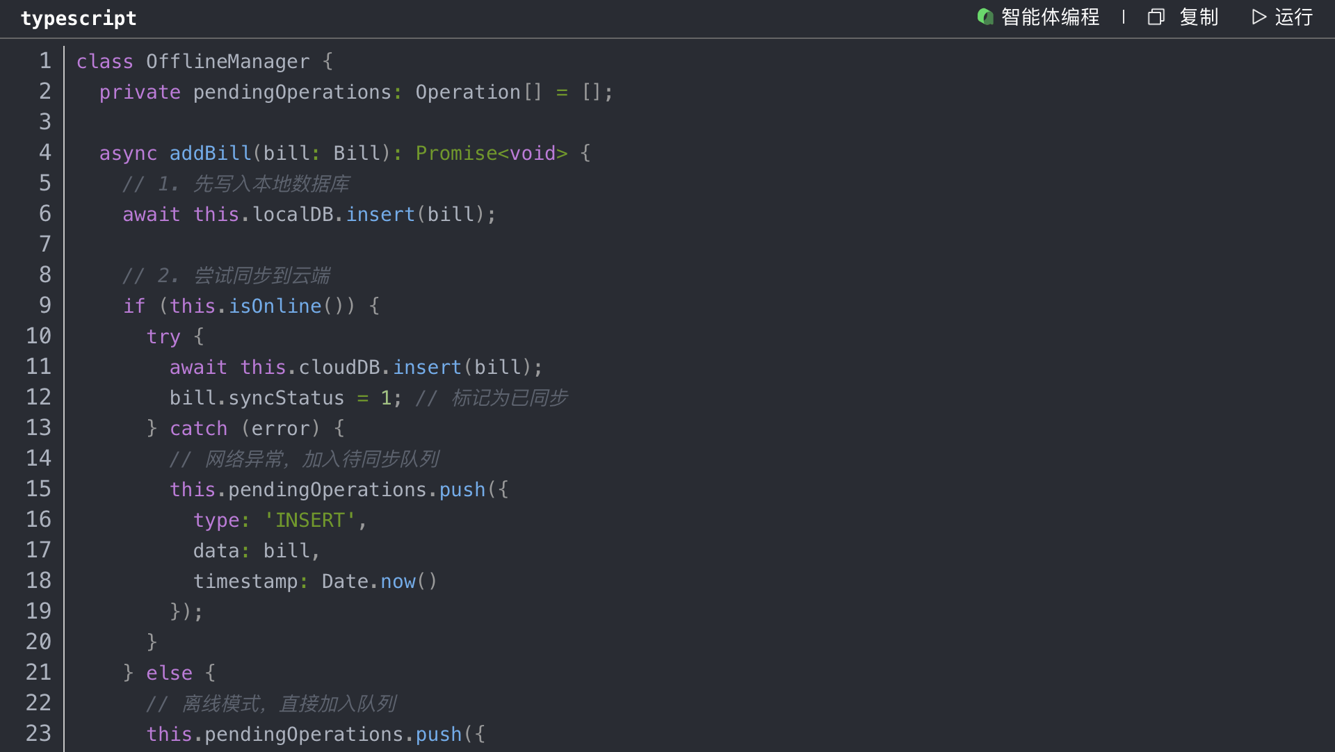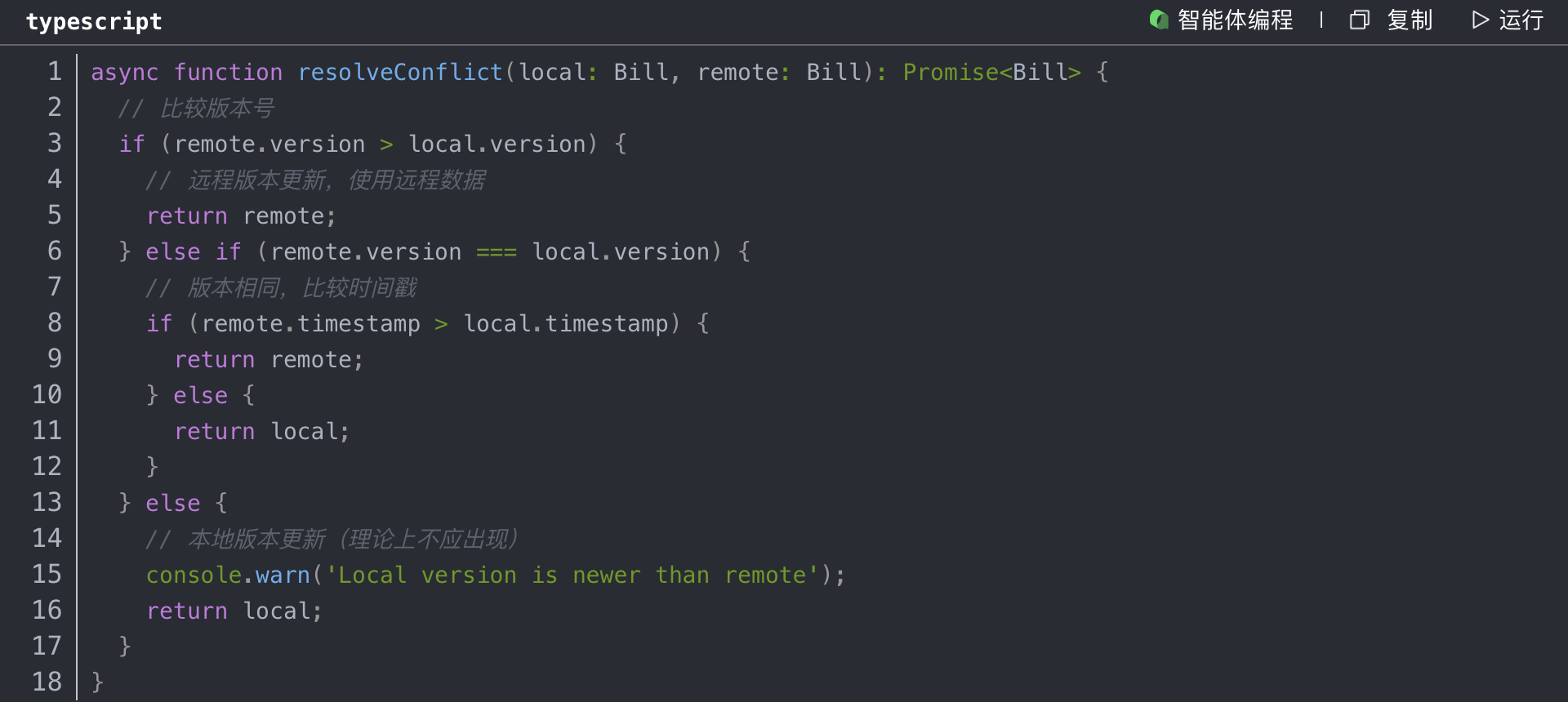 当用户在两台设备上几乎同时修改同一笔账单时,会产生冲突。我们采用"最后写入优先"策略: