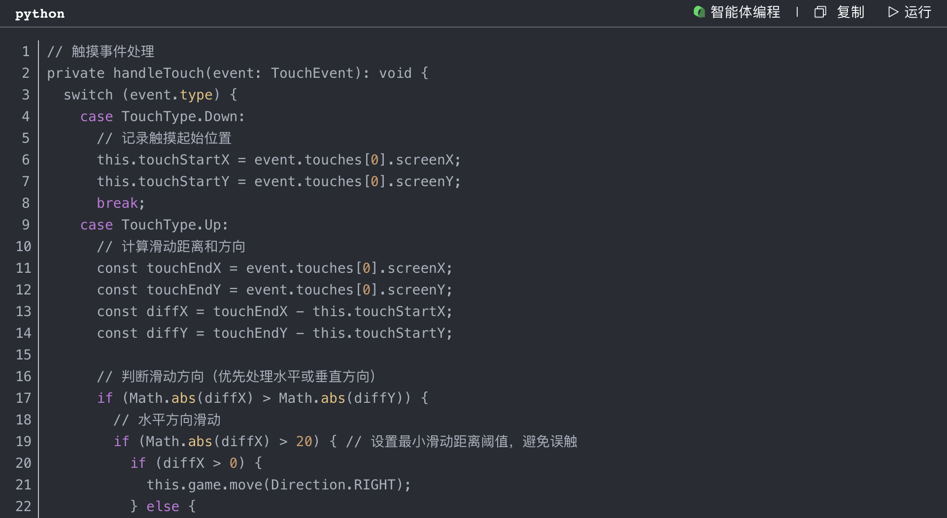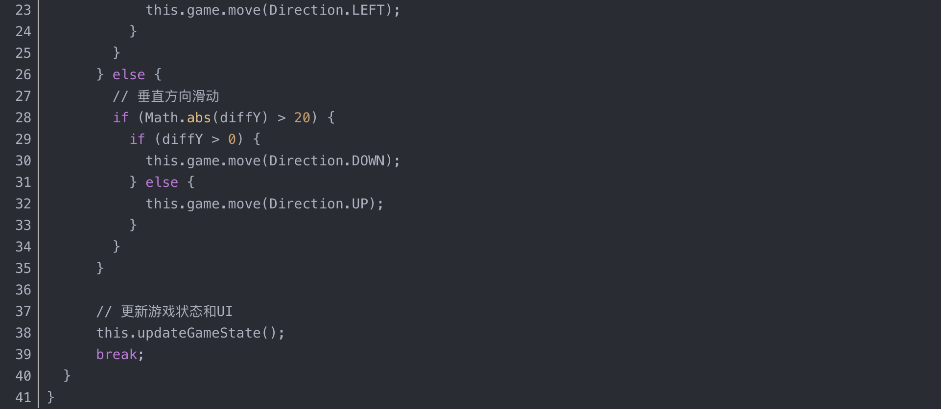 在移动设备上,游戏通过触摸滑动来控制方块的移动。我实现了一个精确的触摸事件处理机制,能够准确识别用户的滑动方向。