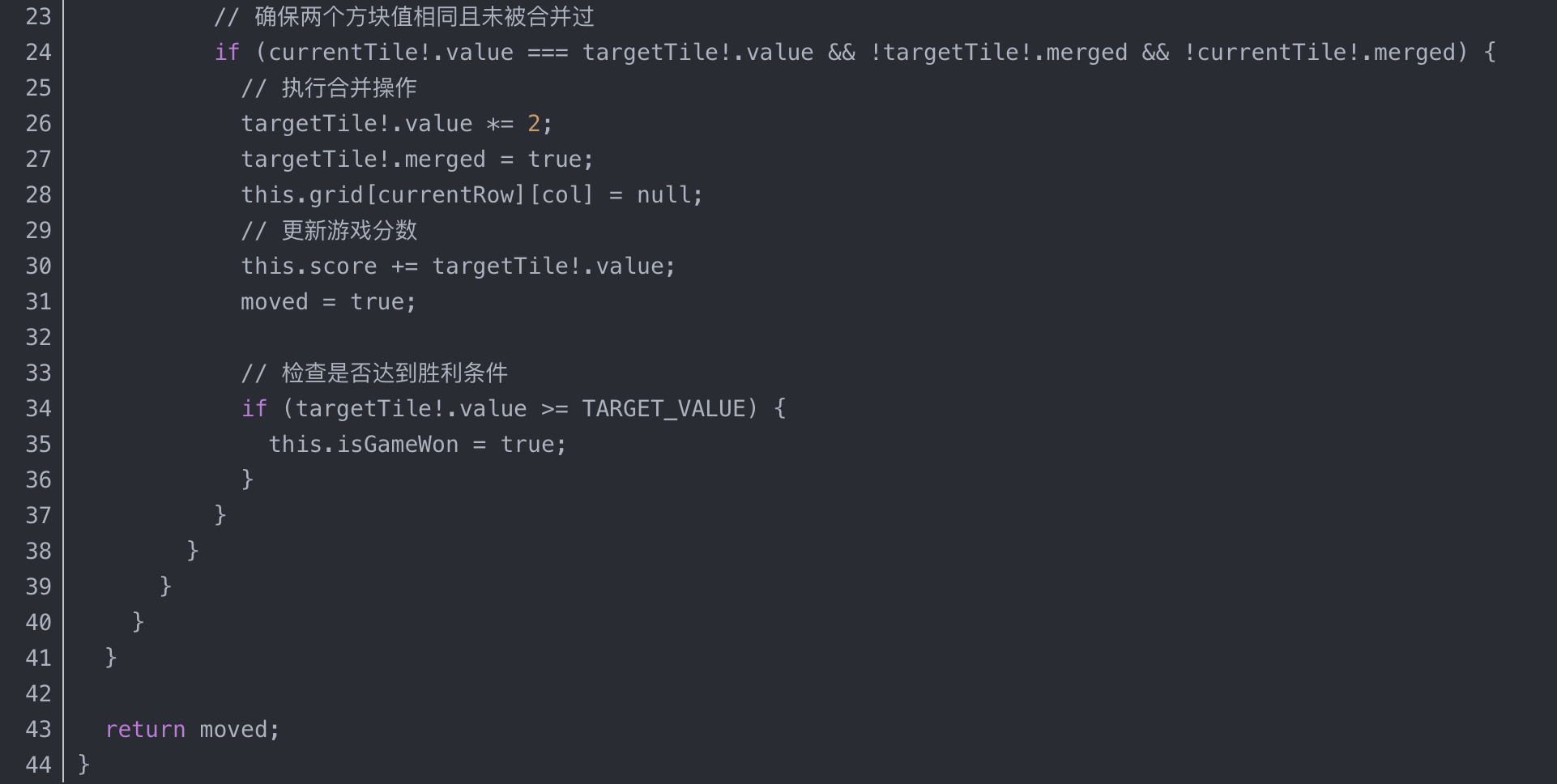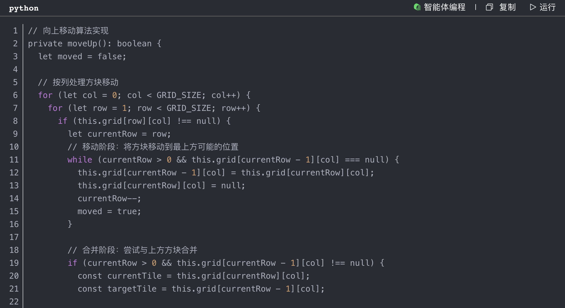 2048游戏的核心逻辑包括方块的移动、合并和游戏状态判断。我采用了面向对象的设计思想,将游戏逻辑封装在Game2048类中。